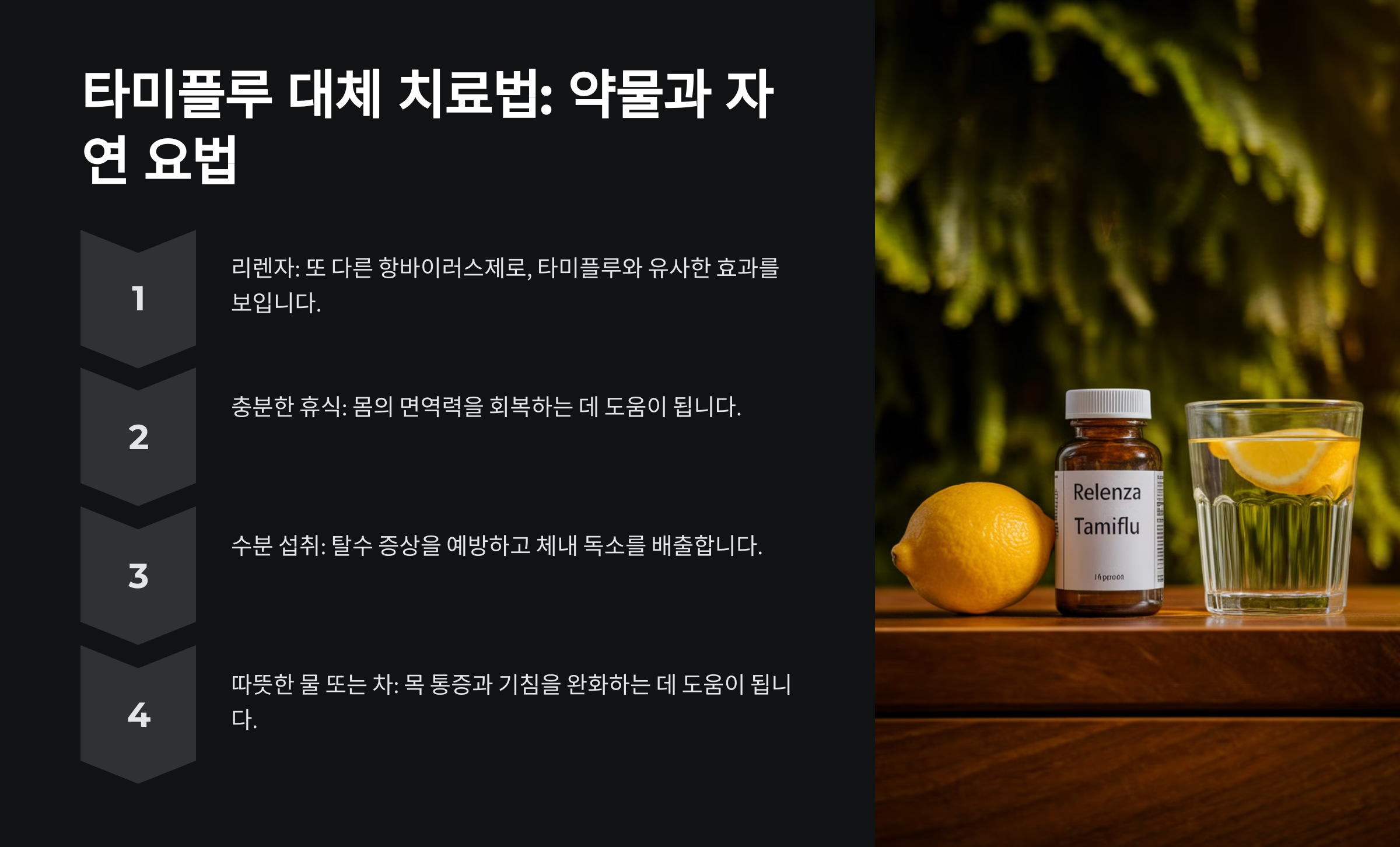 타미플루 외에도 독감을 치료하는 방법은 여러 가지가 있어요. 일부 대체 약물은 타미플루와 비슷한 효과를 내며, 자연 치유법도 면역력을 높이는 데 도움을 줄 수 있어요.
