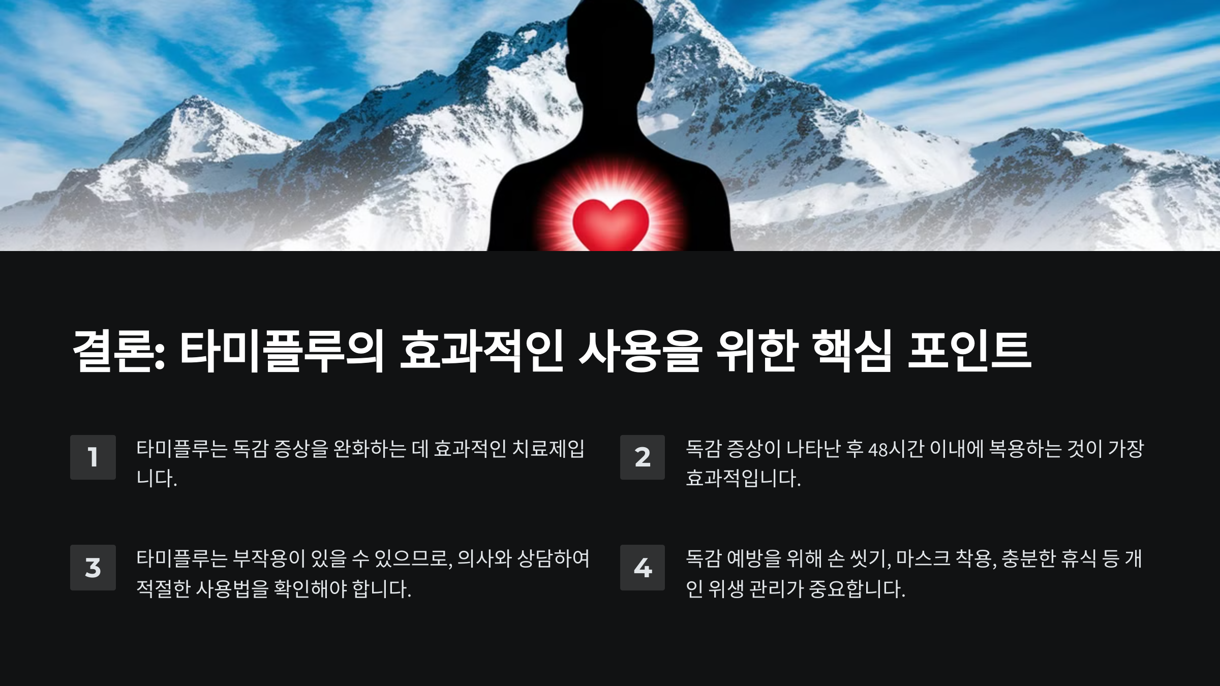또한, 타미플루를 복용 중이라면 절대 단독으로 판단하여 복용을 중단하면 안 돼요. 증상이 나아졌다고 임의로 끊으면 바이러스가 다시 활발해질 수 있기 때문이에요.