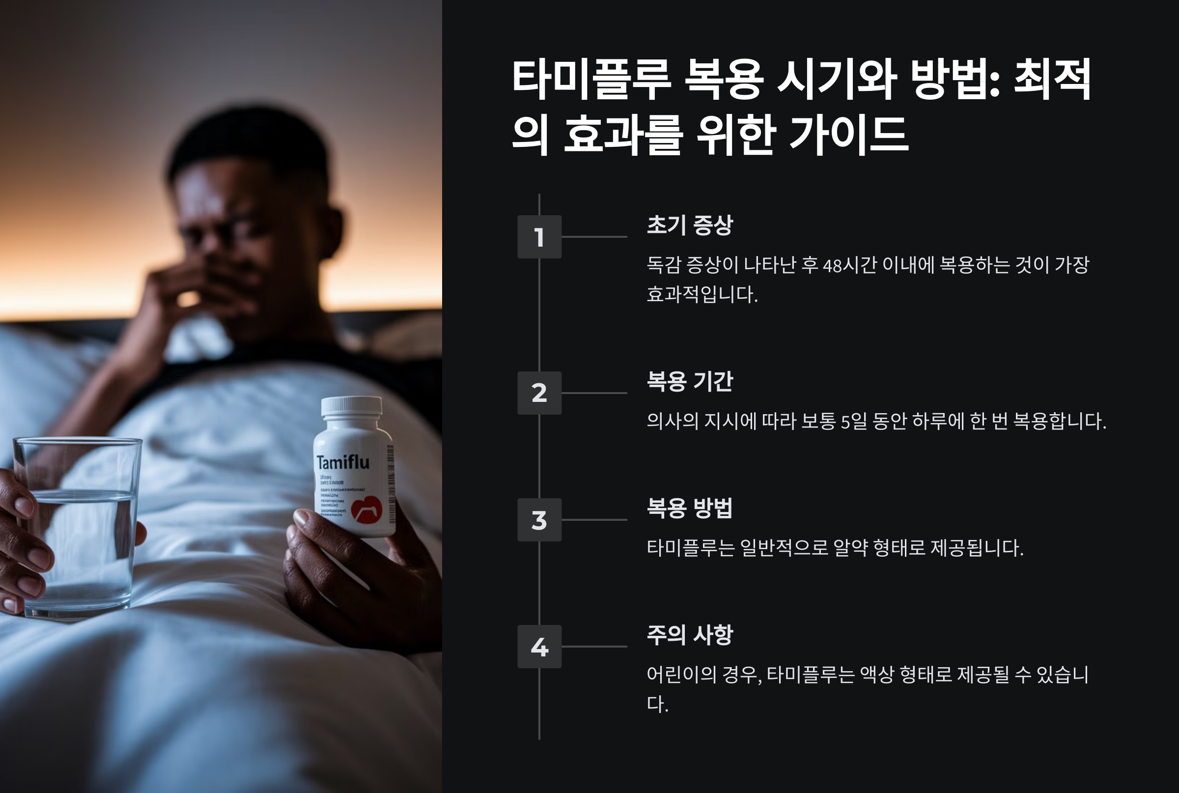 타미플루는 독감 증상이 나타난 후 48시간 이내에 복용해야 효과가 가장 좋아요. 왜냐하면 타미플루는 독감 바이러스가 증식하는 것을 억제하는 역할을 하기 때문에, 바이러스가 퍼지기 전에 차단하는 것이 중요하거든요.