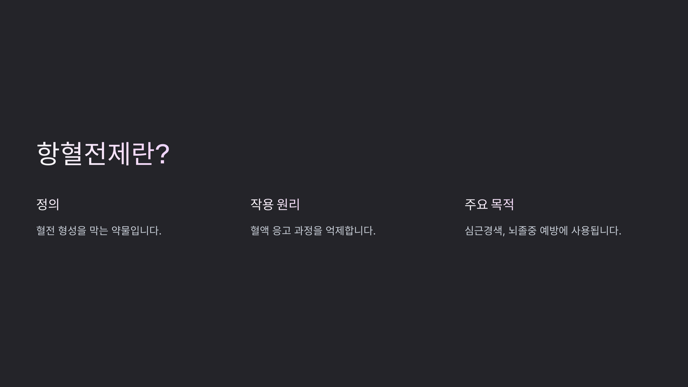 | 항혈소판제 | 혈소판 응집 억제 | 아스피린, 클로피도그렐 | 심근경색, 뇌졸중 예방 |