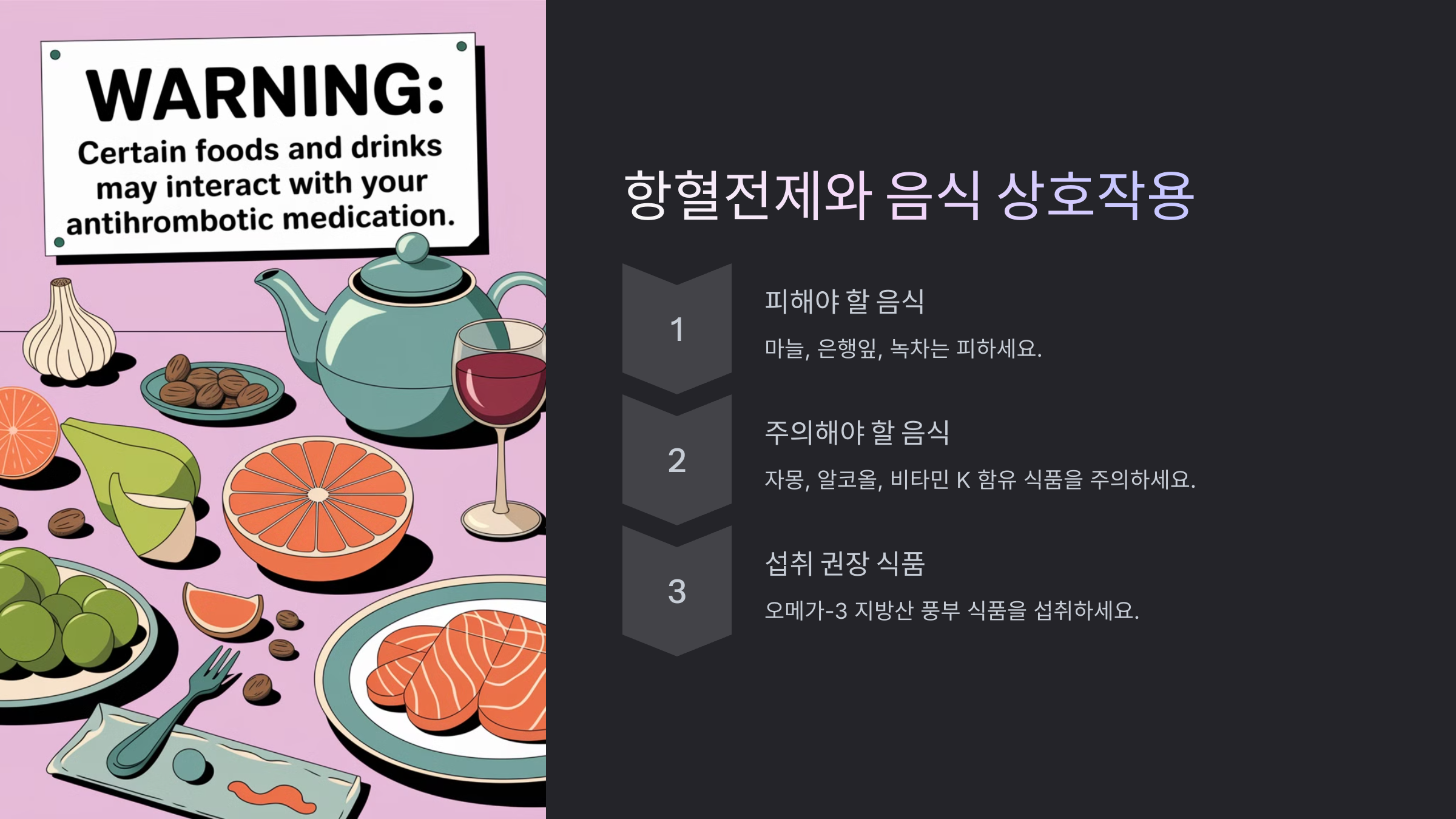 🔜 다음으로 항혈전제와 음식 상호작용, 절대 피해야 할 음식에 대해 알아볼까요?