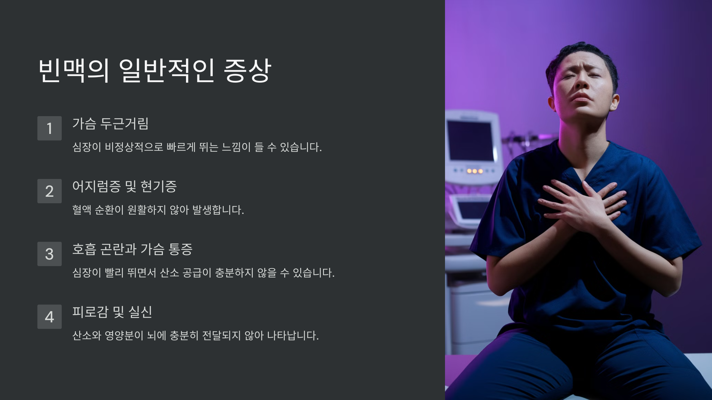 자, 그럼 빈맥의 대표적인 증상부터 하나씩 살펴볼까요?