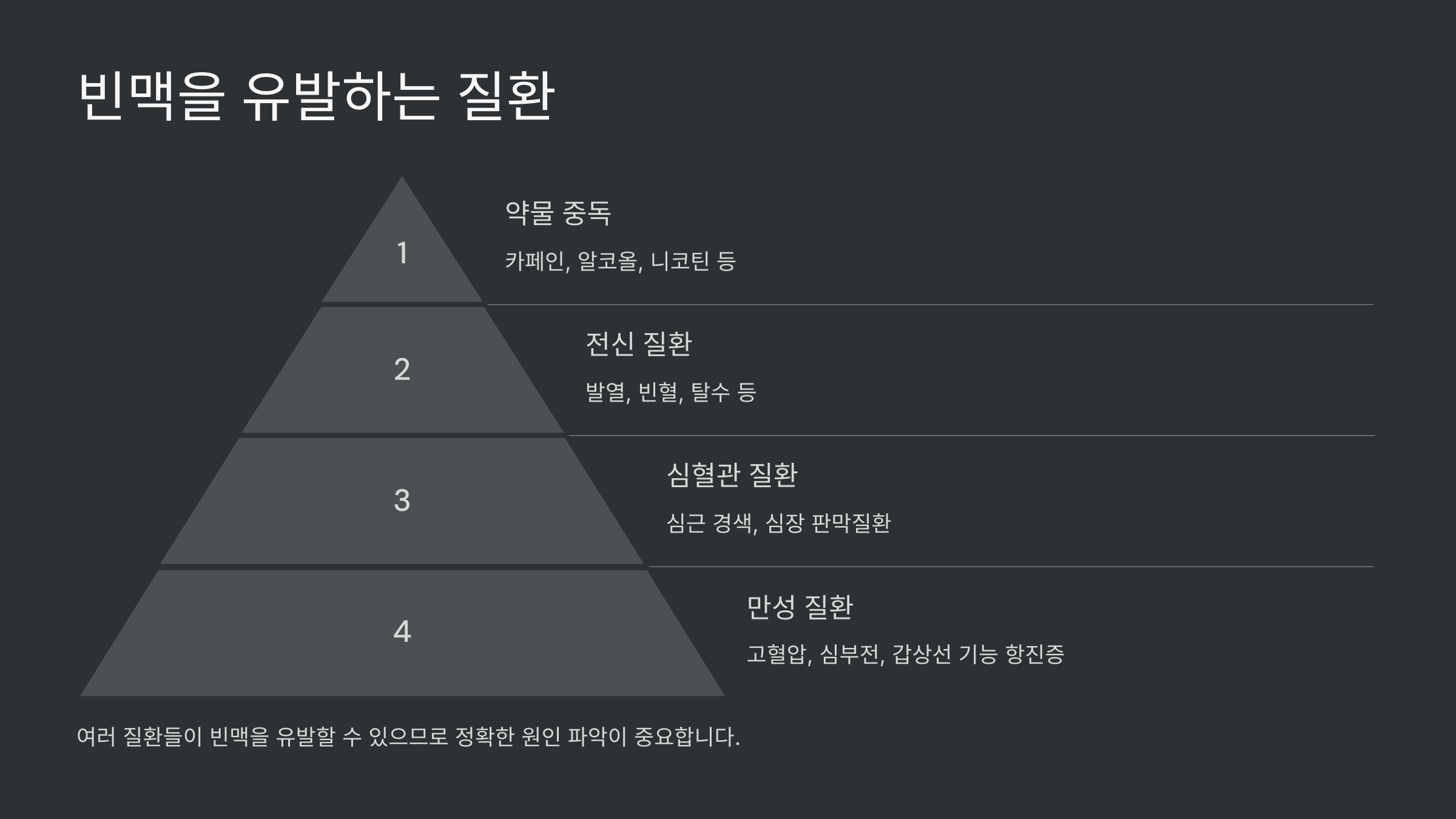 빈맥은 단순히 심장이 빨리 뛰는 것이 아니라, **다양한 질환의 신호**일 수도 있어요. 아래와 같은 건강 문제들이 빈맥을 유발할 수 있답니다.
