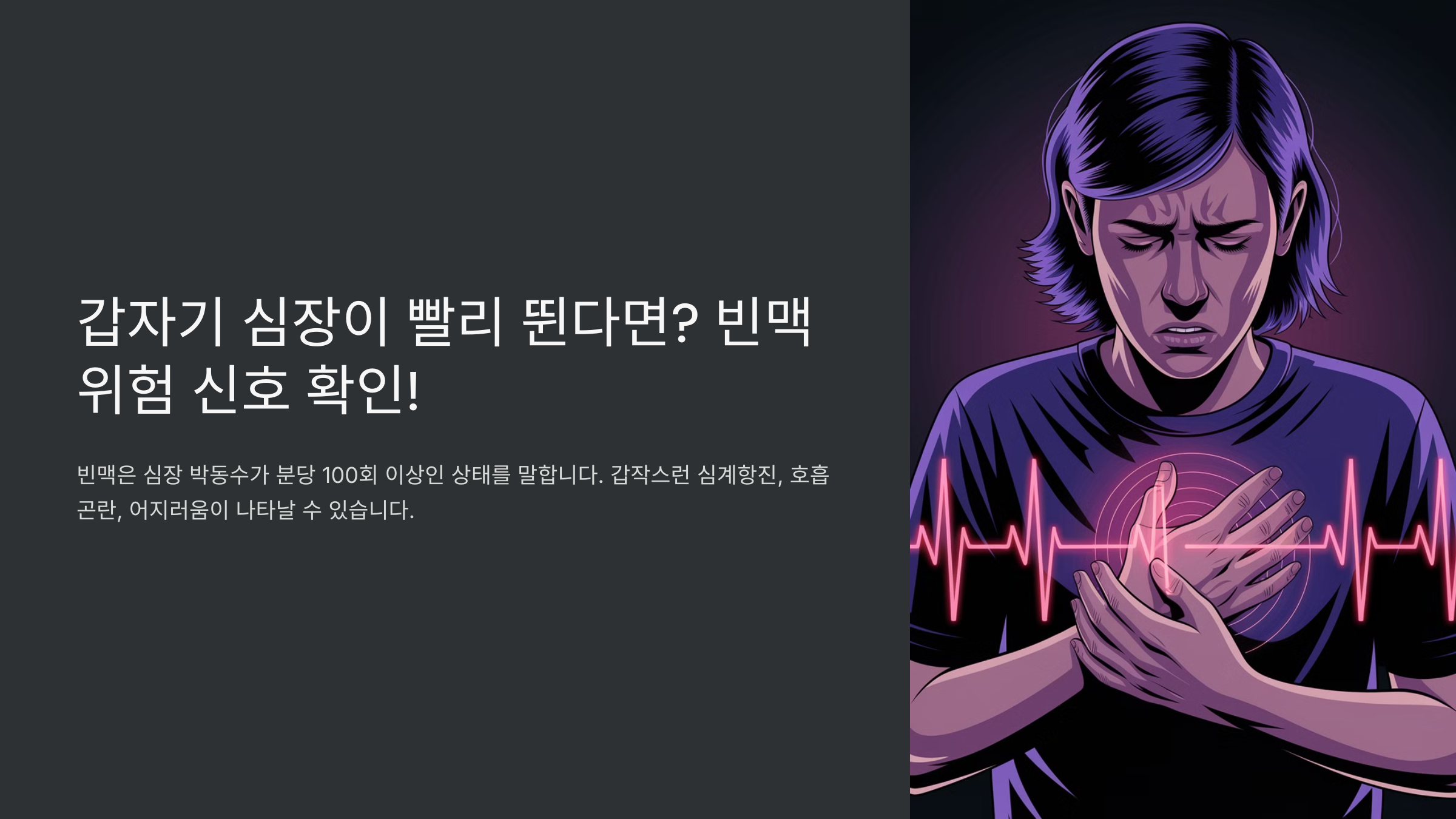 갑자기 심장이 빠르게 뛰는 경험, 해본 적 있나요? 💓 일시적인 긴장이나 운동 때문일 수도 있지만, 빈맥이 지속된다면 건강에 대한 신호일 수 있어요. 빈맥(Tachycardia)은 심박수가 분당 100회 이상으로 빨라지는 상태를 의미하며, 원인에 따라 위험할 수도 있답니다.
