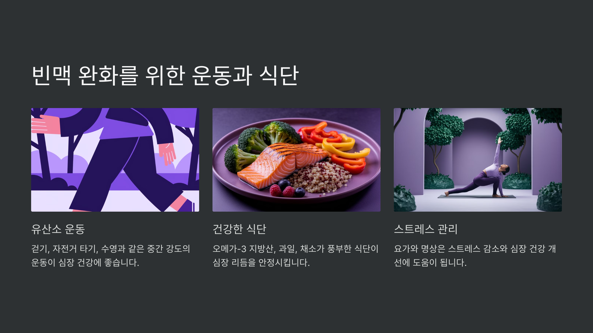반대로 **카페인, 알코올, 나트륨이 많은 음식**은 피하는 것이 좋아요. ⚠️ 과도한 자극은 심장을 더 빨리 뛰게 만들 수 있거든요!