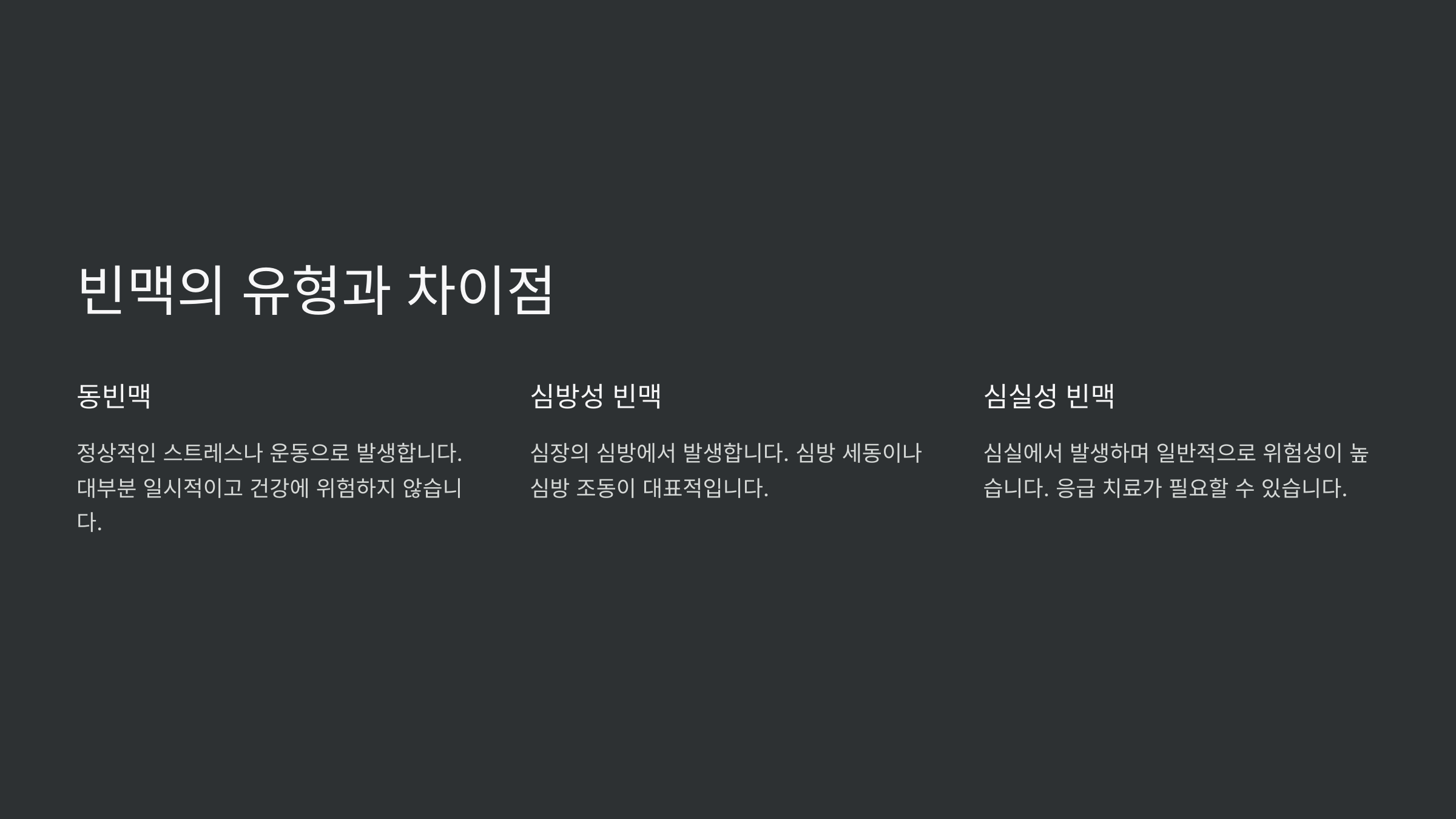 이러한 증상이 반복된다면 단순한 스트레스 문제가 아닐 수도 있어요. 다음으로 빈맥의 다양한 유형에 대해 알아볼게요! 📖