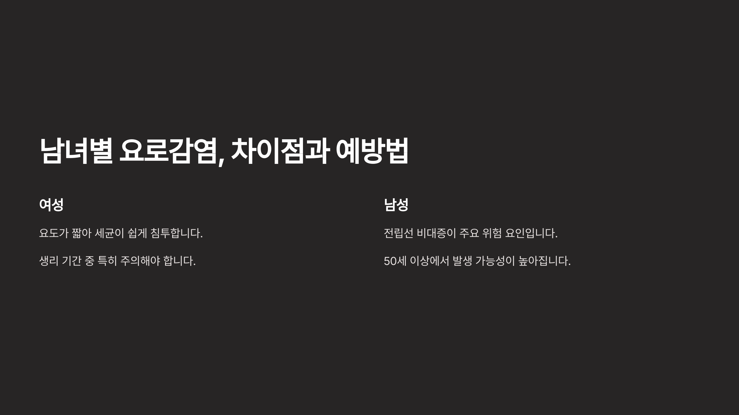다음 섹션에서는 남성과 여성의 요로감염 차이점과 예방법을 알아볼게요!👇