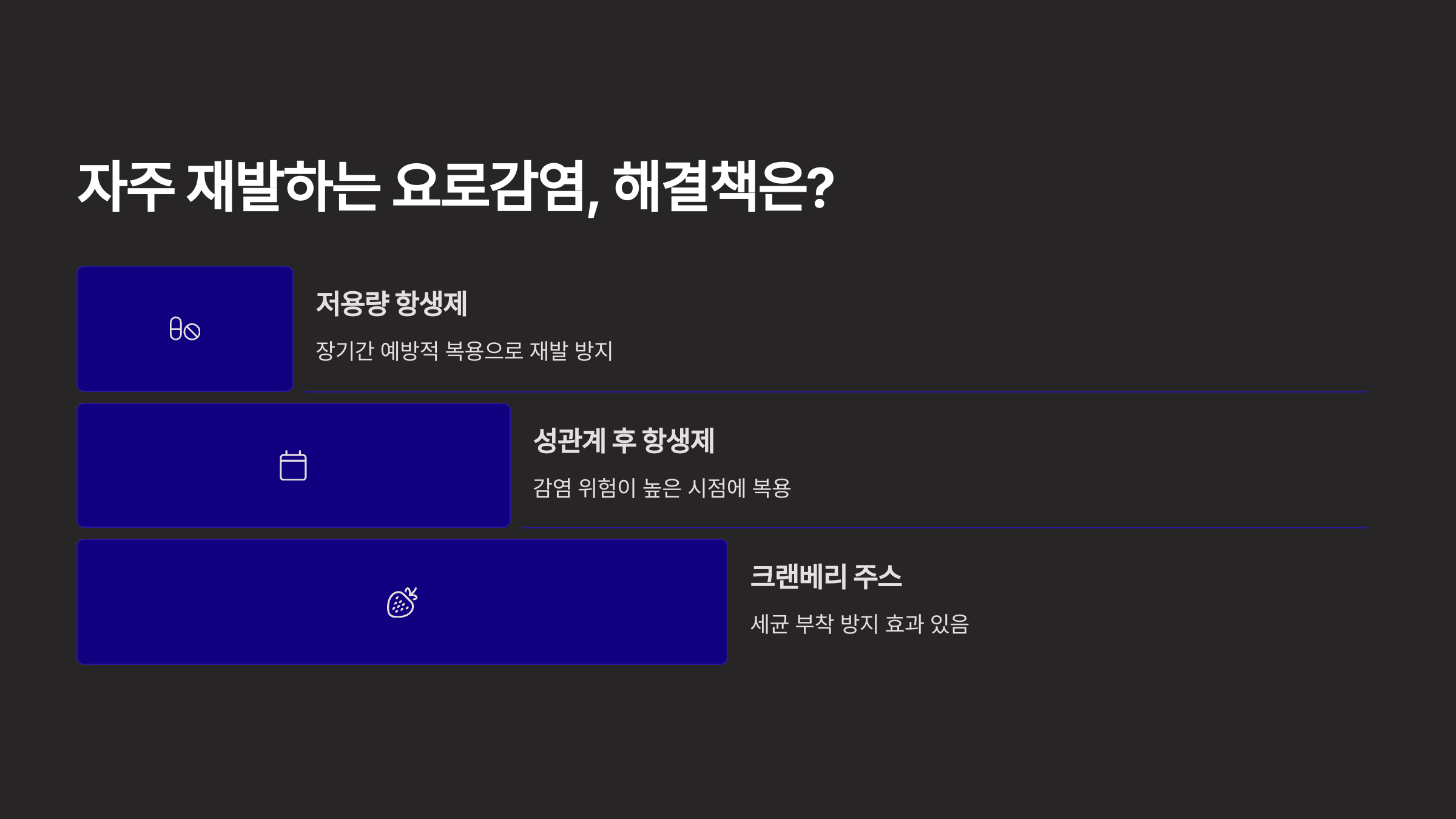 이처럼 생활 습관을 조금만 신경 쓰면 요로감염을 예방할 수 있어요. 다음 섹션에서는 재발하는 요로감염을 어떻게 해결할 수 있는지 알아볼게요! ⏩