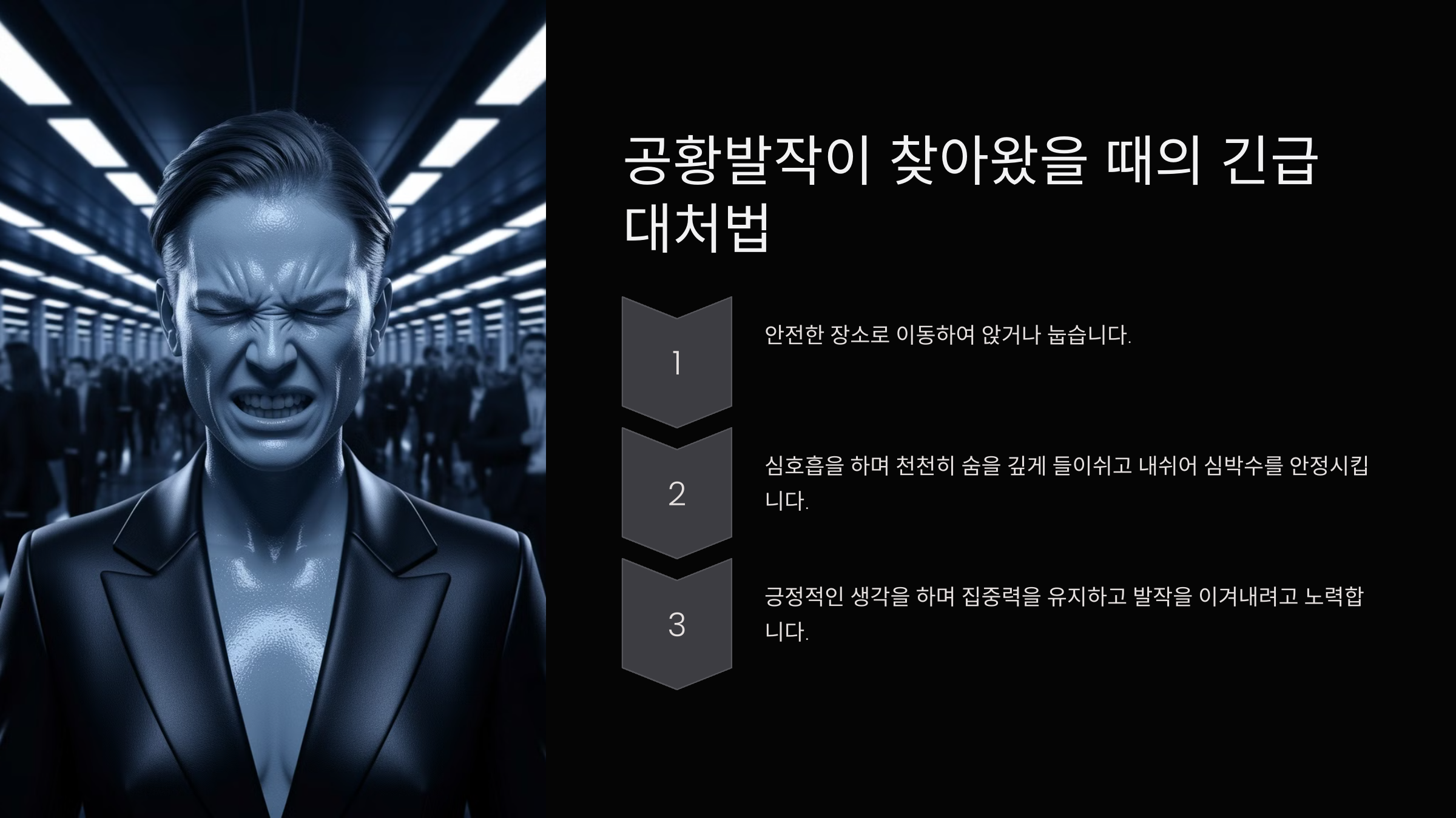 마음 챙김 명상과 깊은 호흡법을 연습하면 공황발작이 왔을 때 빠르게 안정할 수 있어요. 4-7-8 호흡법(4초 들이마시기, 7초 멈추기, 8초 내쉬기)을 추천해요.