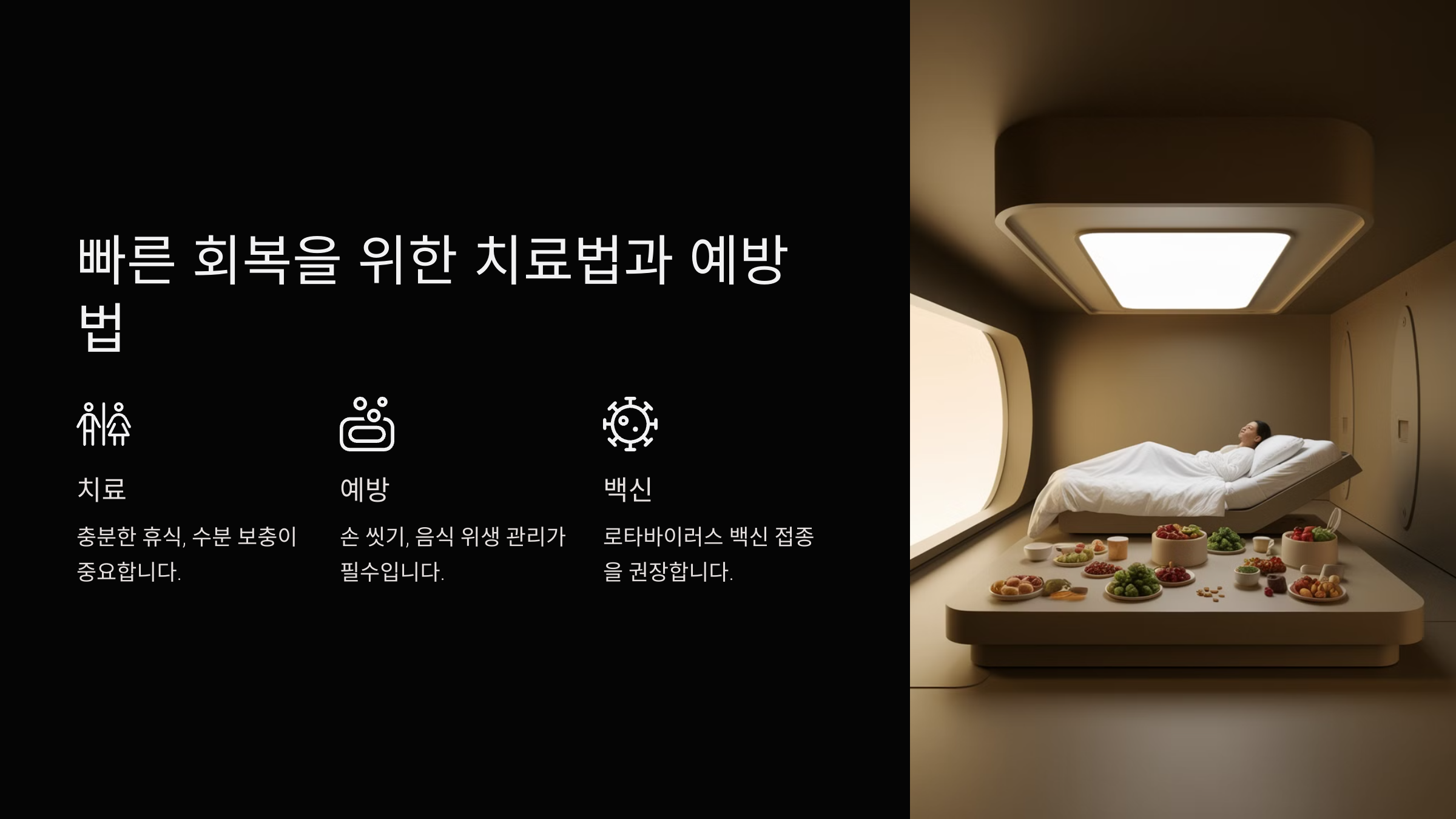 | 언제 병원에 가야 할까? | 고열, 심한 설사, 탈수 증상 | 심한 피로, 어지럼증, 의식 저하 |