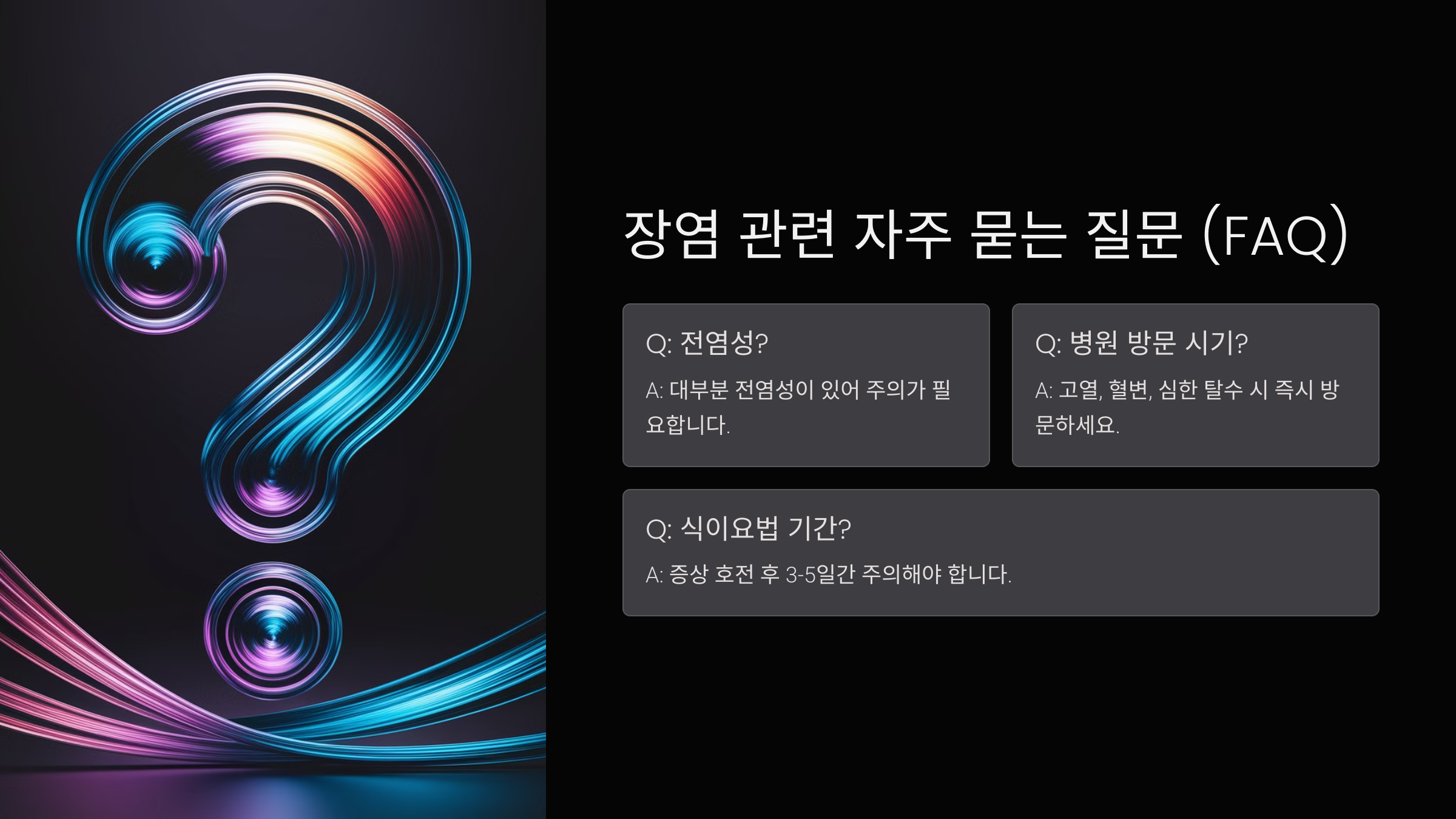 이제 마지막으로, 장염에 대해 사람들이 자주 묻는 질문들을 정리해볼게요! 🧐