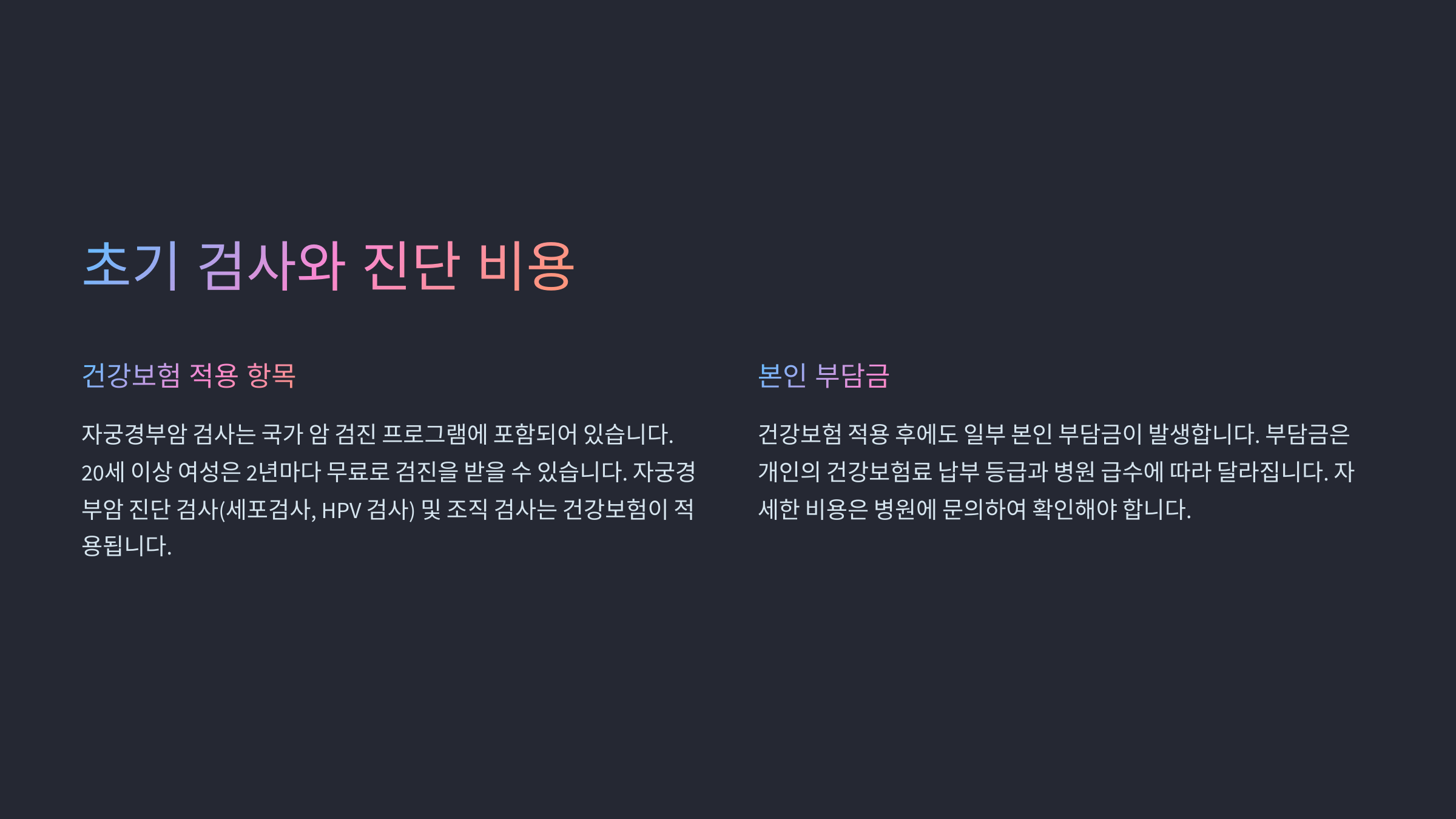 - 🔹 산정특례제도: 자궁경부암 환자는 건강보험 산정특례 적용 가능 (본인 부담 5%로 경감)