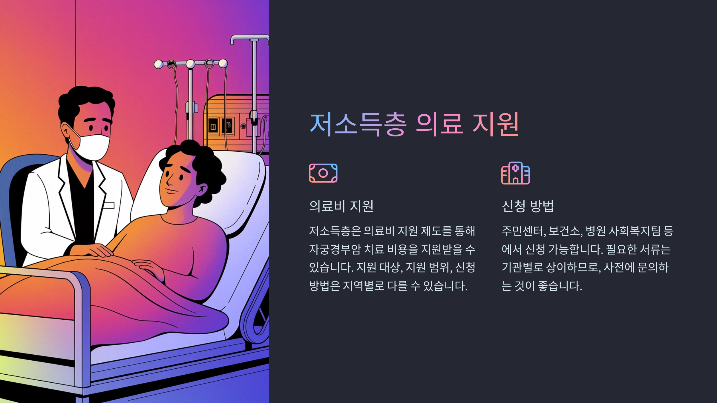 자궁경부암 치료는 장기적인 과정이 필요한 만큼, 경제적 부담이 클 수 있어요. 특히 저소득층 가정을 위한 정부 지원 정책을 잘 활용하면 치료비 부담을 줄일 수 있답니다.