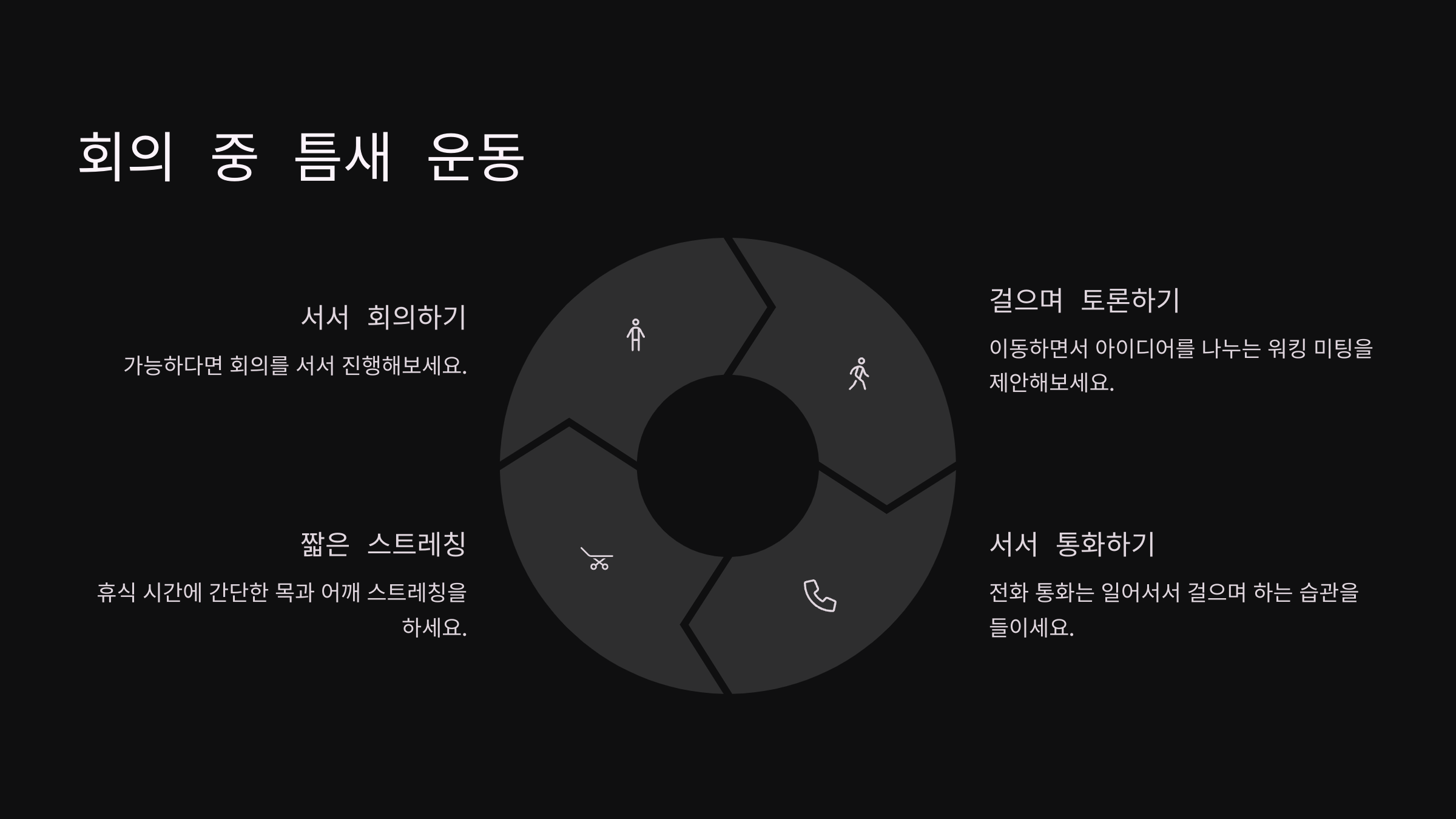 틈틈이 몸을 움직이면 회의 내 집중력도 높아지고, 몸의 긴장도 줄어들어요. 업무 성과도 쑥쑥!