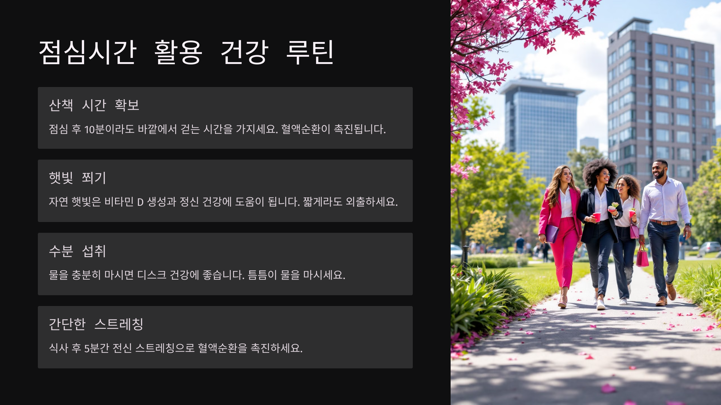 점심시간을 건강하게 보내면 오후 업무가 훨씬 수월해져요. 오늘부터 한 번 실천해봐요!