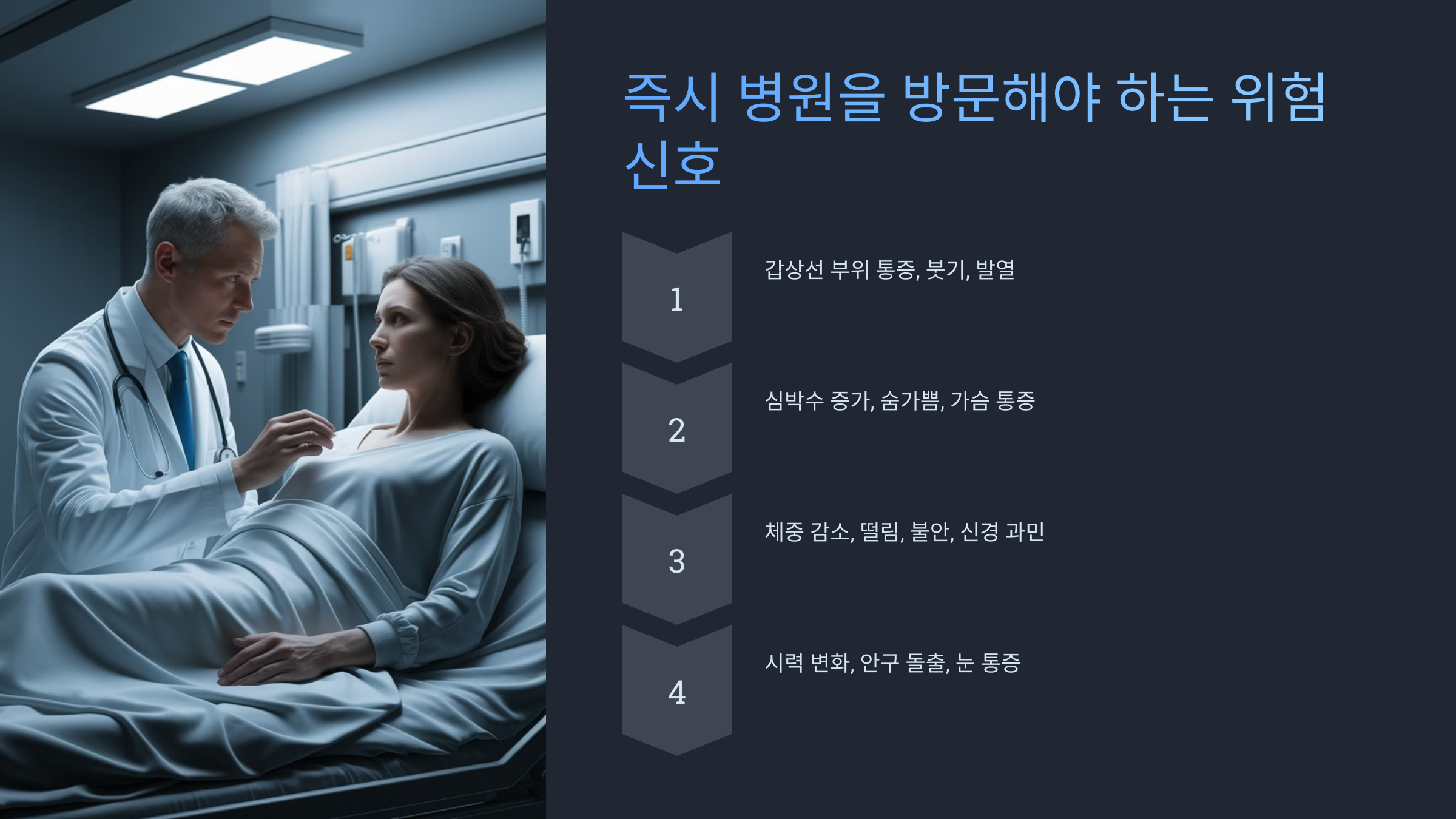 마지막으로, 눈이 심하게 돌출되거나 시야 이상이 발생하는 경우 즉시 병원을 찾아야 해요. 이는 갑상선 관련 안질환(그레이브스 안병증)일 가능성이 있어 조기에 관리하는 것이 중요해요.