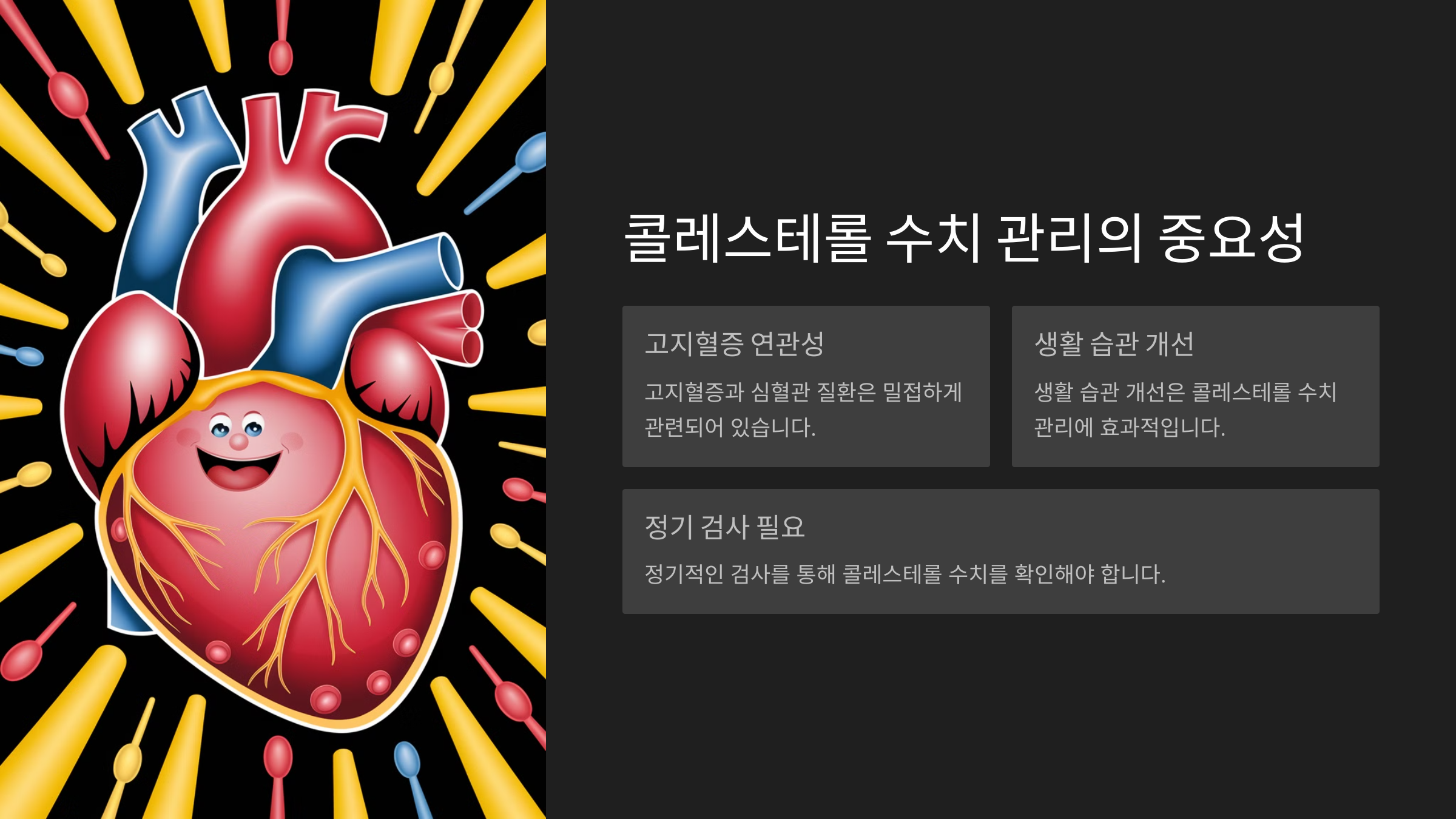 콜레스테롤은 관리만 잘하면 건강을 유지할 수 있는 만큼, 정기적인 검사와 생활습관 개선이 필수예요! 🥗🏋️♂️