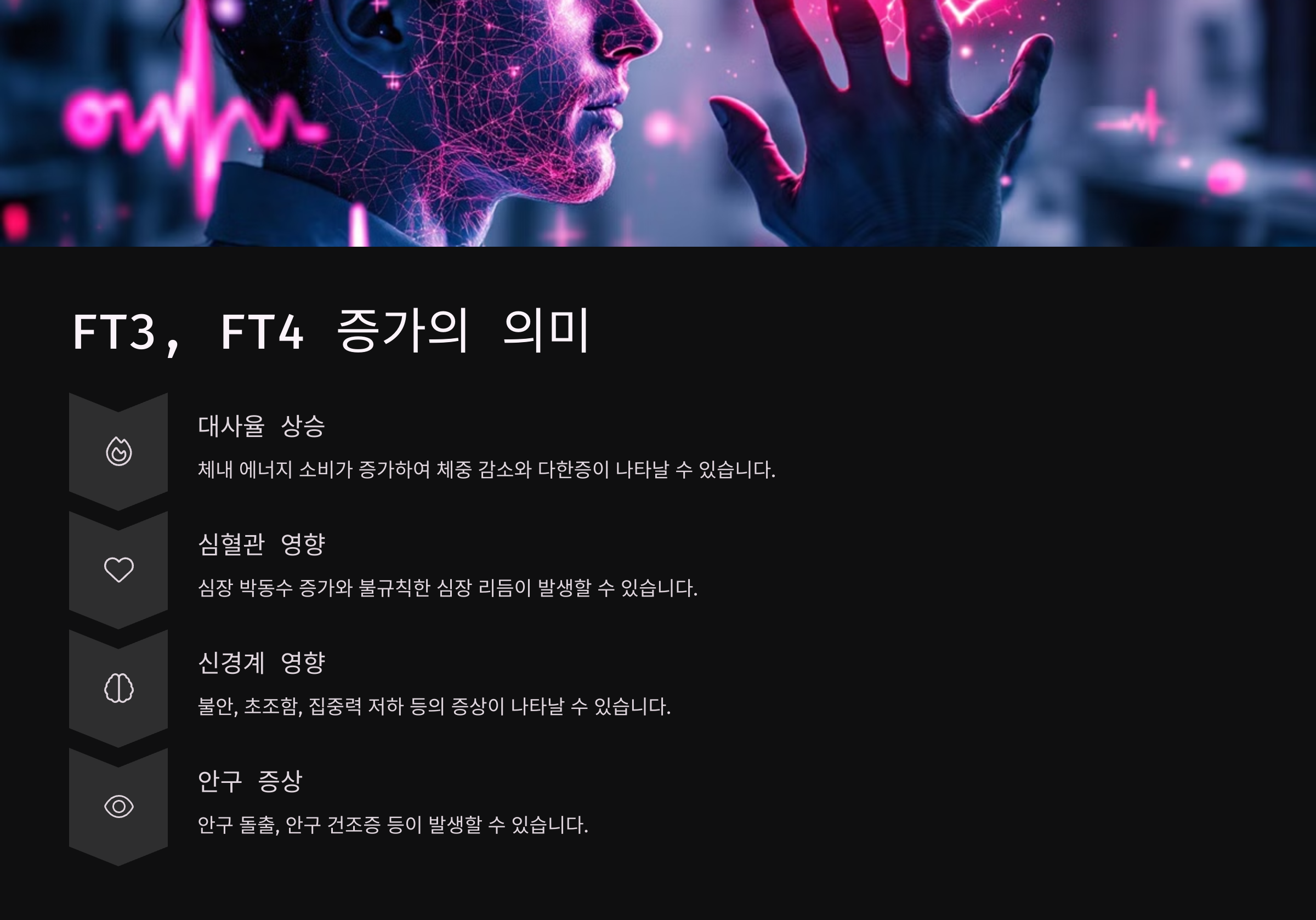 | FT4 | 갑상선기능항진증 | 불안, 체중 감소, 심박 증가 |