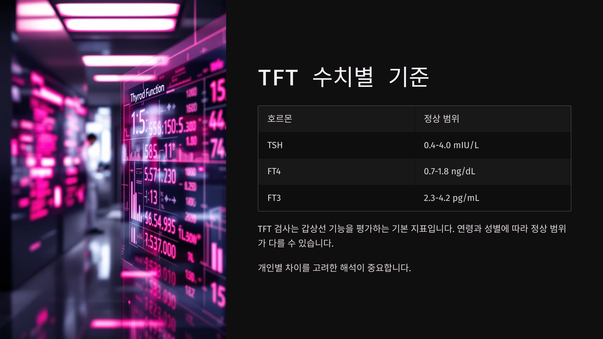 갑상선기능검사(TFT)는 정상 수치 범위를 기준으로 갑상선이 과도하게 활동 중인지, 부족한지, 아니면 안정적인 상태인지를 파악해요. 하지만 병원마다 기준이 조금씩 다를 수 있고, 개인의 연령, 성별, 건강 상태에 따라 다르게 해석될 수 있어요. 그래서 정확한 진단은 전문의 판단이 꼭 필요하답니다.
