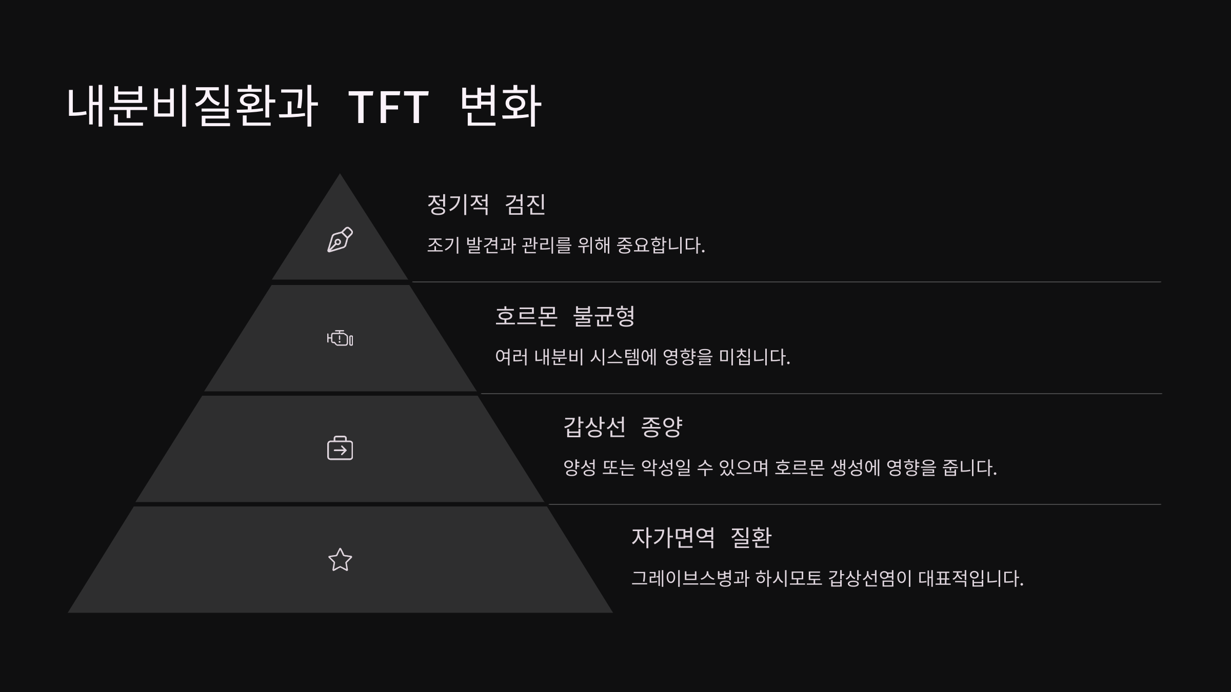 TFT는 단순히 갑상선 상태만을 보여주는 검사가 아니에요. 우리 몸의 다양한 내분비 질환과도 연결되어 있어서, 여러 호르몬 축의 이상을 함께 보여주는 신호탄 역할을 해요. 갑상선은 부신, 뇌하수체, 생식샘 같은 기관들과 복잡하게 연결돼 있거든요.