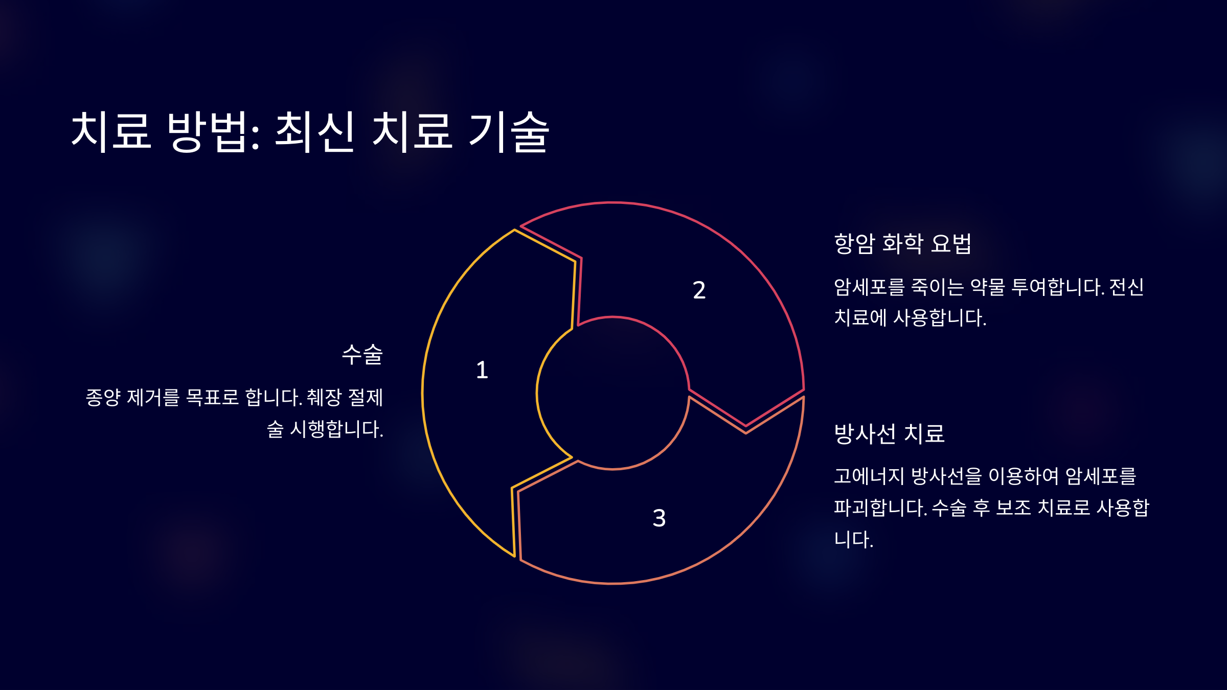 | 항암 화학요법 | 약물로 암세포 성장 억제 | 수술이 불가능한 환자도 치료 가능 | 부작용이 심할 수 있음 |