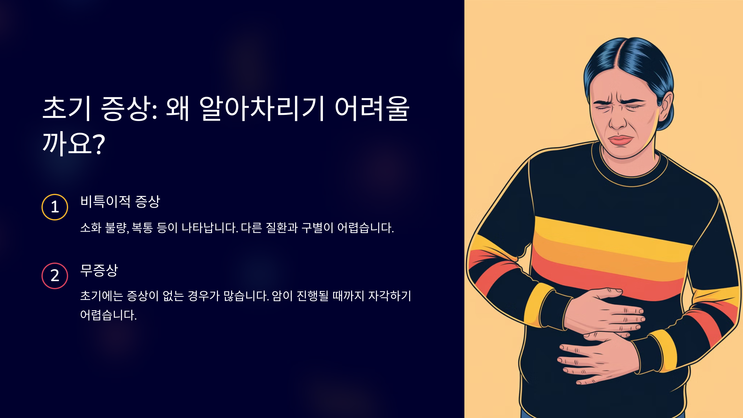 이제 본격적으로 췌장암의 초기 증상에 대해 알아볼게요. 초기 증상을 알아두면 조기 진단에 큰 도움이 될 거예요. 🚨