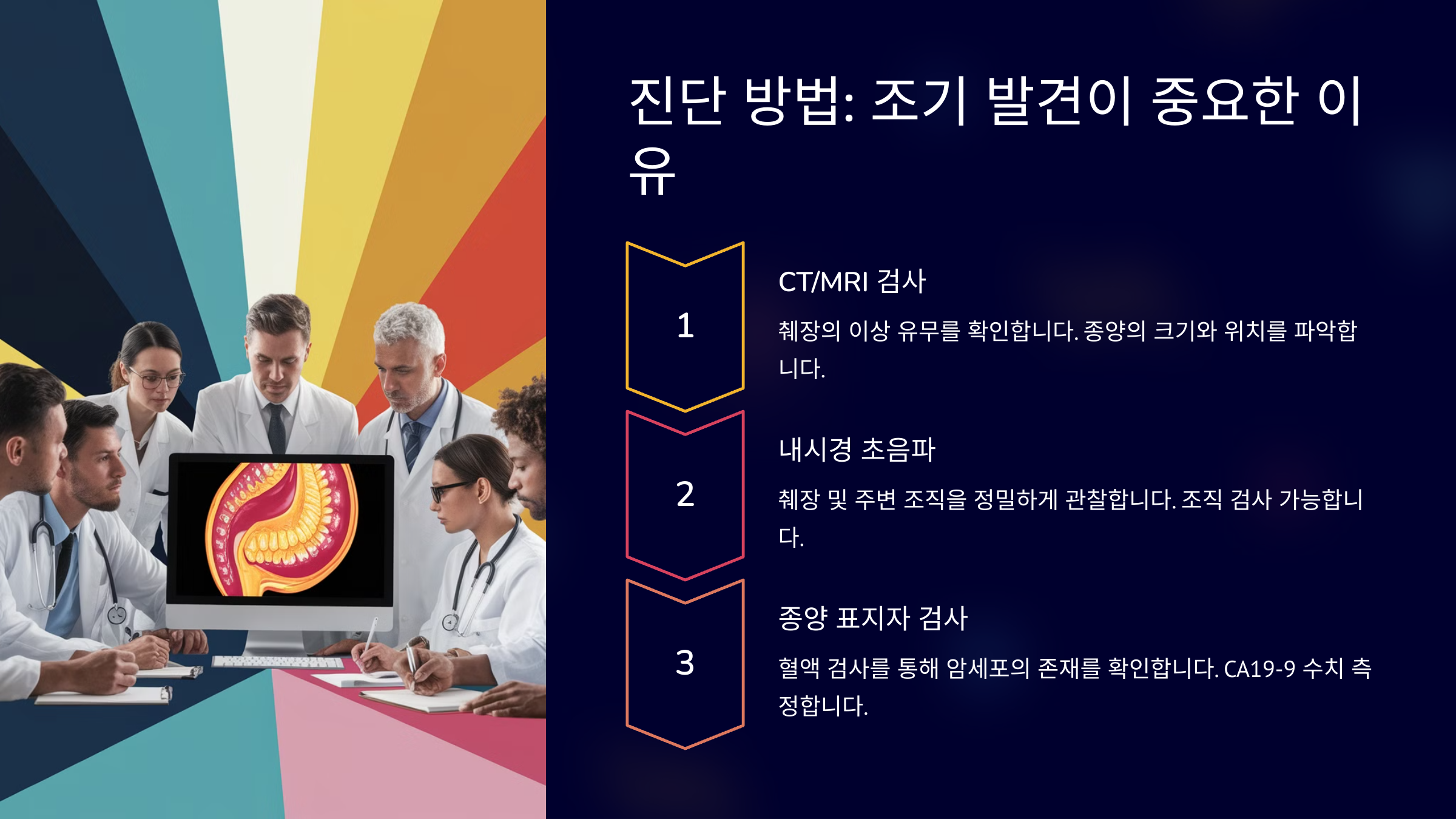 이처럼 다양한 검사를 조합해 췌장암을 진단할 수 있어요. 조기에 발견하면 치료 가능성이 높아지기 때문에 정기 검진이 중요해요. 🏥
