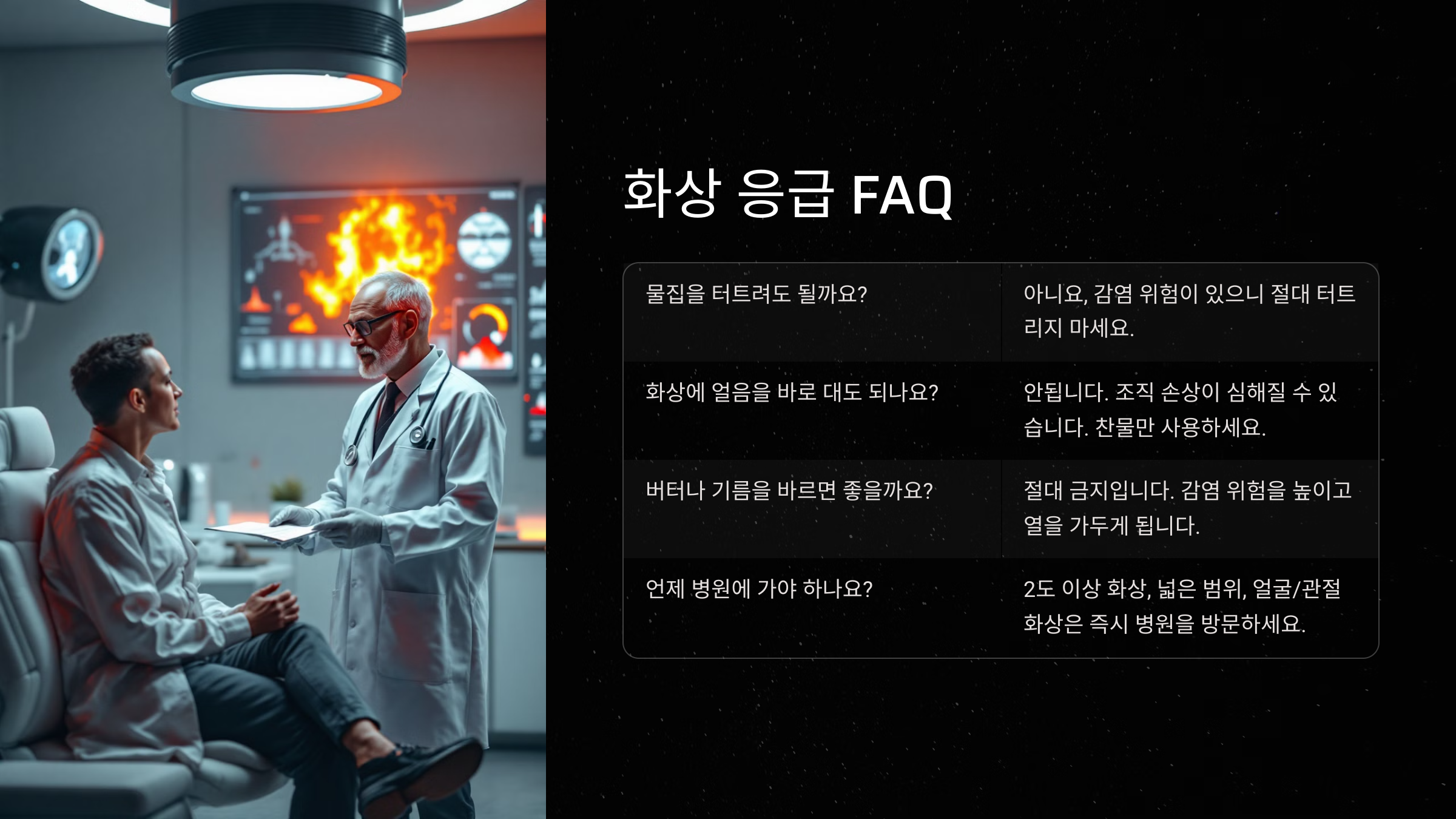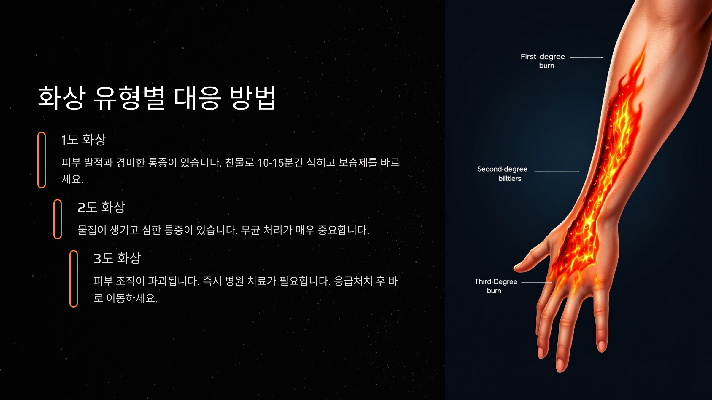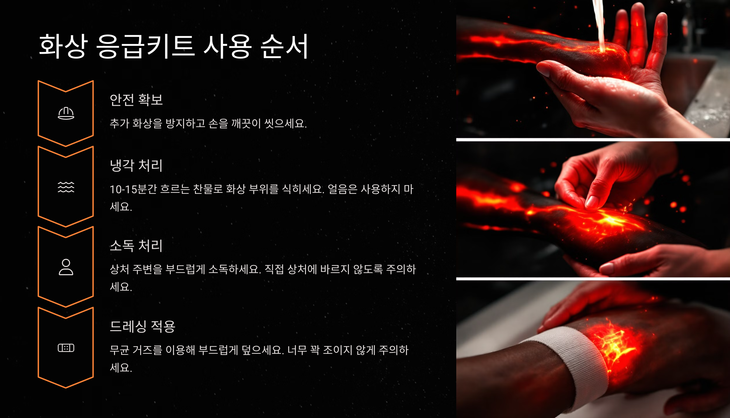 정리하자면, 열기 제거 → 냉각 → 세척 → 드레싱 → 이동, 이 다섯 단계만 기억하면 돼요. 연습삼아 가족들과 응급상황 시뮬레이션 해보는 것도 좋은 방법이에요. 실전에서는 놀라지 않고 움직이는 게 핵심이니까요. 🚨
