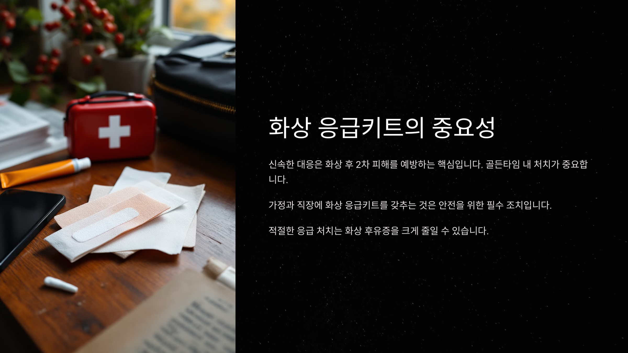 이렇게 구성된 응급키트는 화상의 심각도를 빠르게 파악하고, 병원 도착 전까지 최적의 처치를 할 수 있게 도와줘요. 다음은 집에서 어떤 도구들을 준비하면 좋은지에 대한 이야기를 해볼게요! 🏠