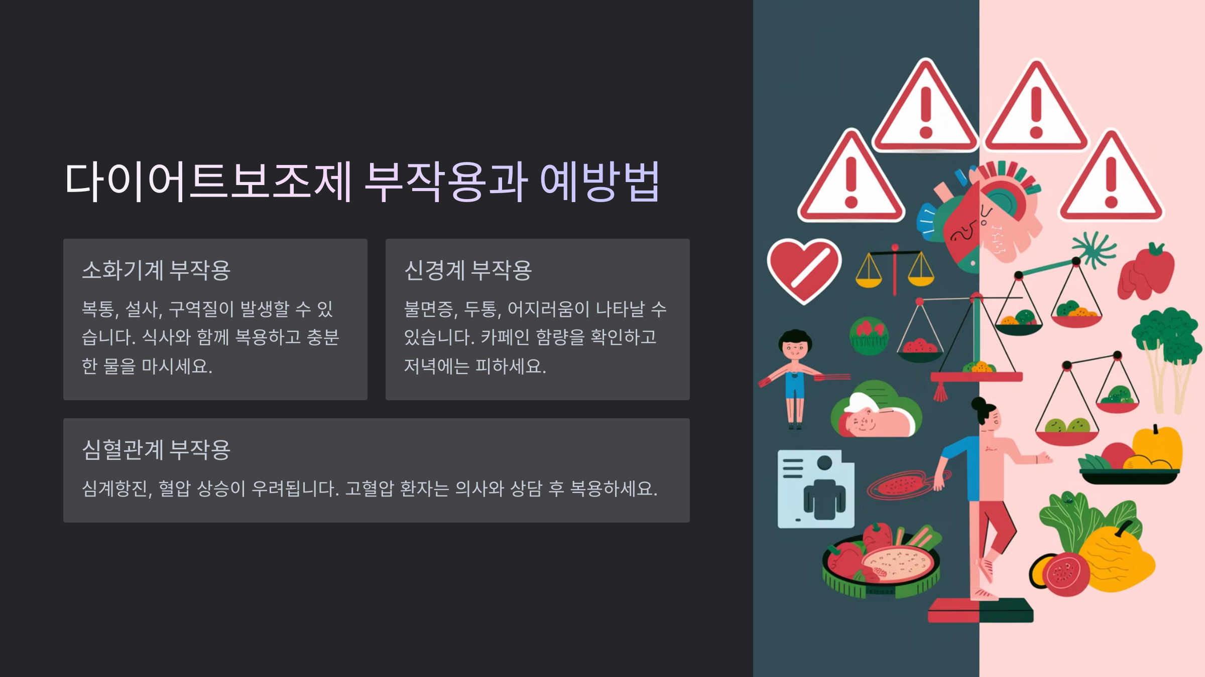 그럼 이제 다이어트보조제의 부작용과 이를 예방하는 방법도 알아볼까요? ⚠️👇