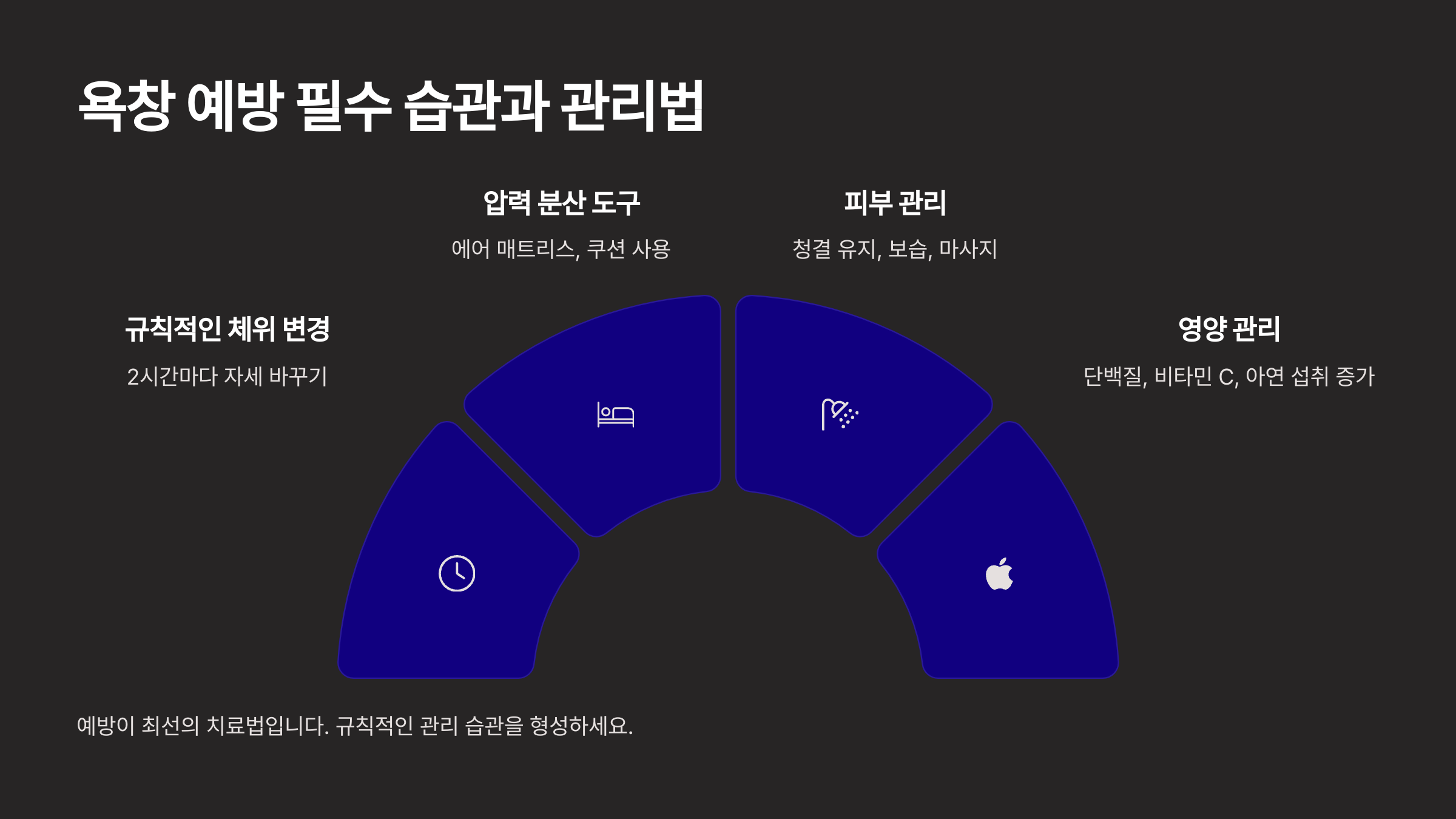 이러한 습관을 꾸준히 실천하면 욕창을 예방할 수 있어요. 만약 욕창이 생겼다면 초기 단계에서 바로 치료하는 것이 중요해요.
