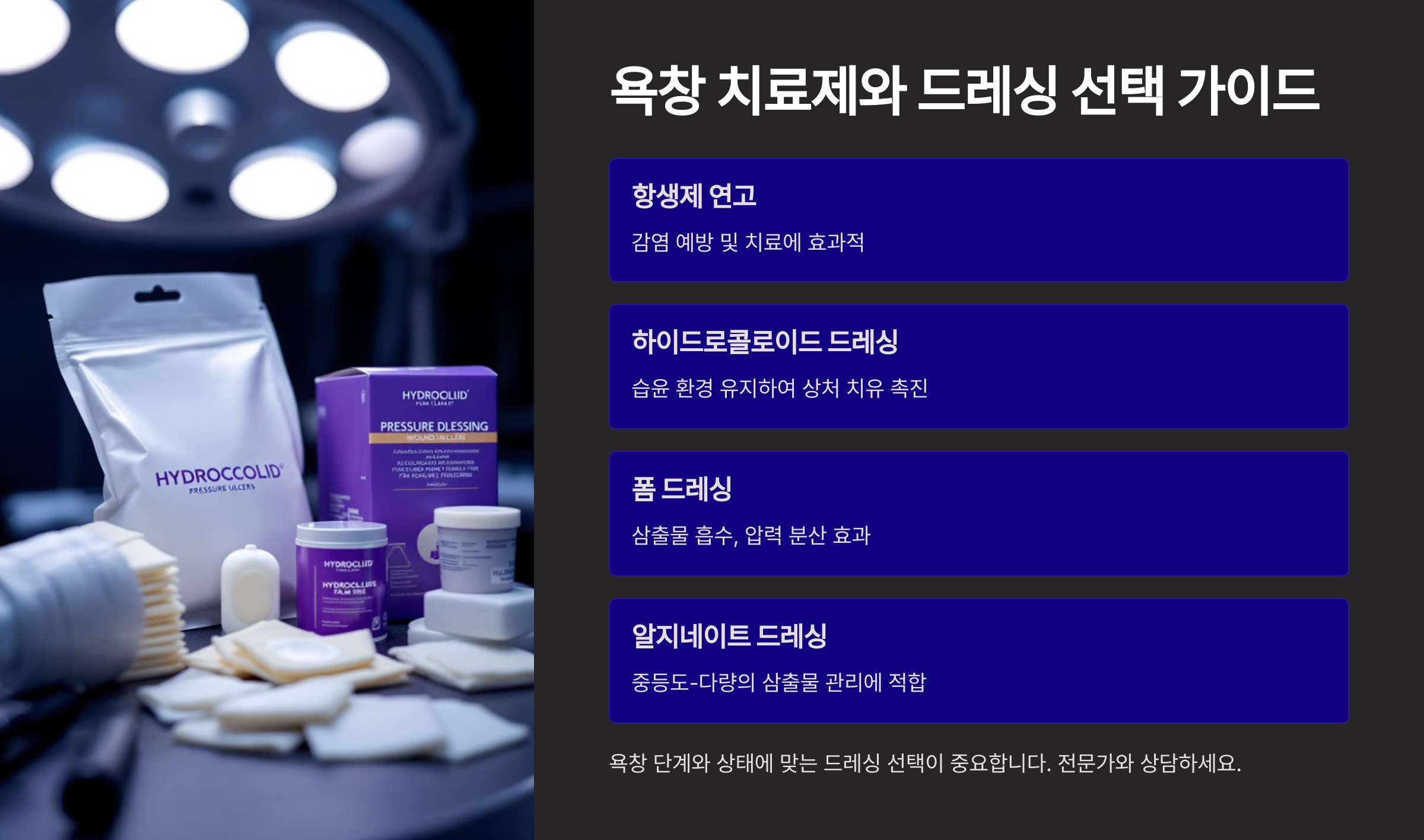 욕창 치료에서 중요한 것은 적절한 치료제와 드레싱을 선택하는 것이에요. 상처 상태에 따라 적절한 제품을 사용해야 회복 속도를 높일 수 있어요.
