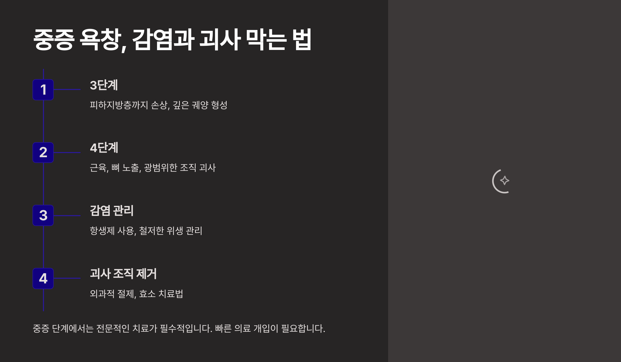 욕창이 1~2단계일 때 빠르게 대응하면 심각한 합병증을 막을 수 있어요. 하지만 3~4단계로 진행되면 괴사나 감염 위험이 커지기 때문에 적극적인 치료가 필요해요. 다음 섹션에서 중증 욕창을 관리하는 법을 알아볼게요. ⚠️