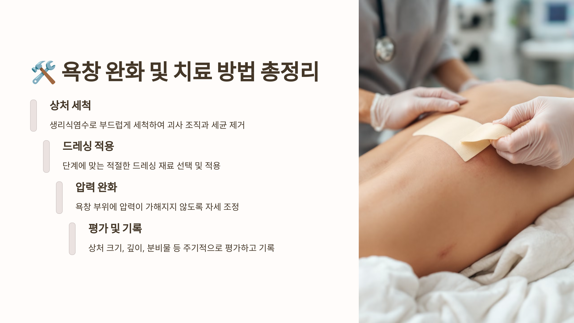 욕창이 발생했다면 단계별로 적절한 치료를 해야 해요. 초기에 빠르게 대처하면 심각한 감염을 막을 수 있어요! 💊