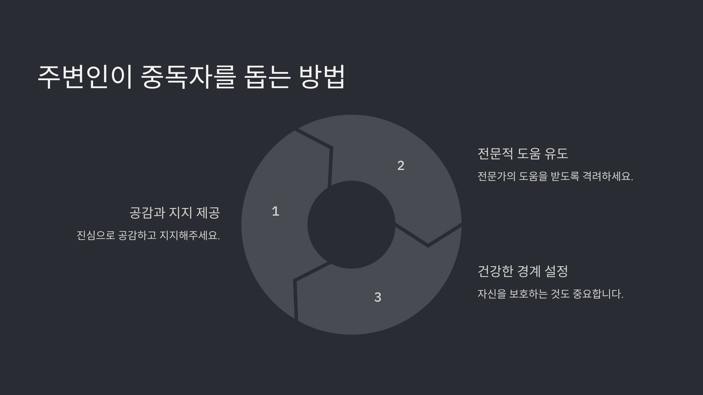 | 비난하지 않기 | 중독자는 이미 죄책감을 느끼고 있음. 비난보다는 공감이 필요 |