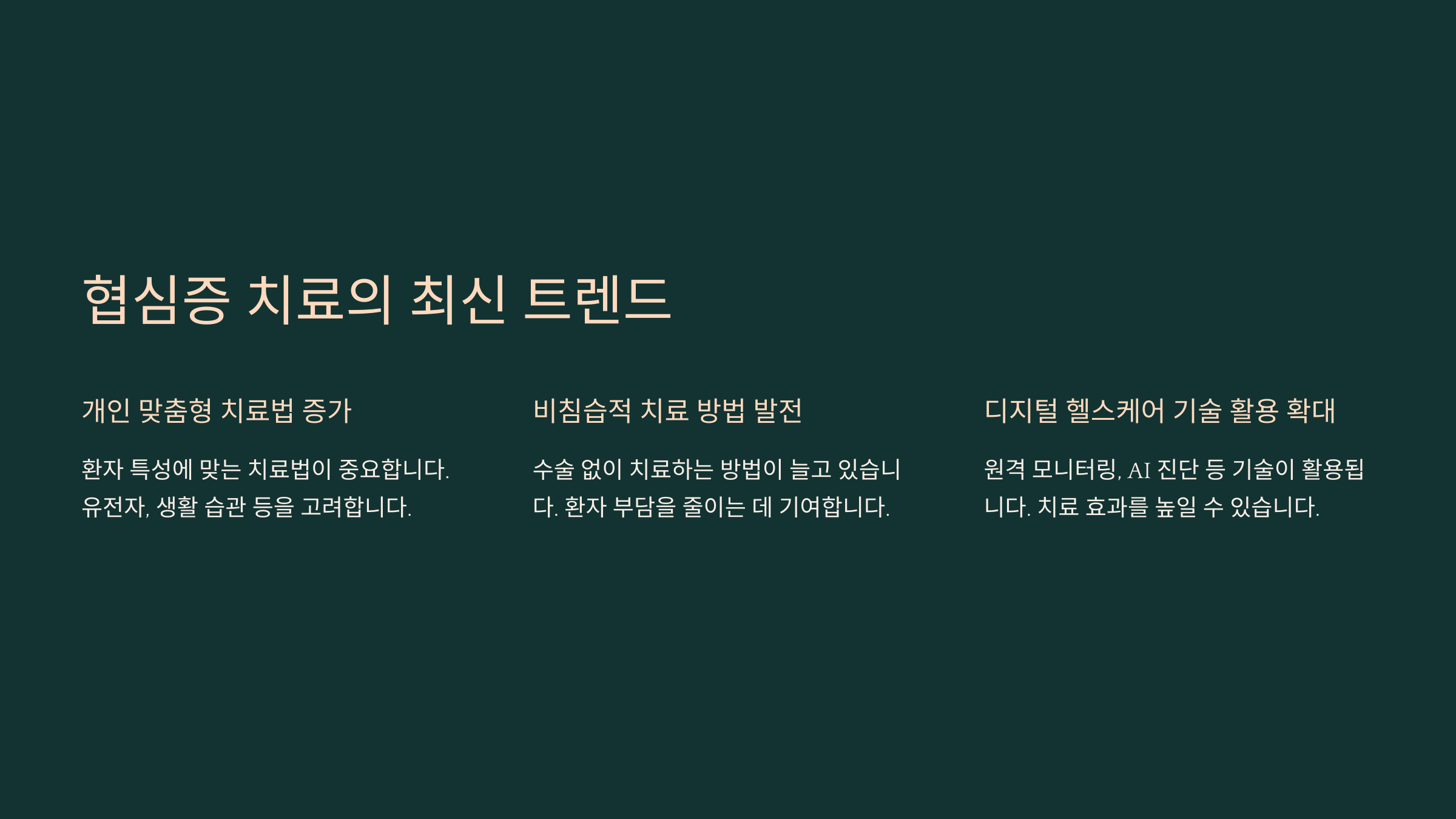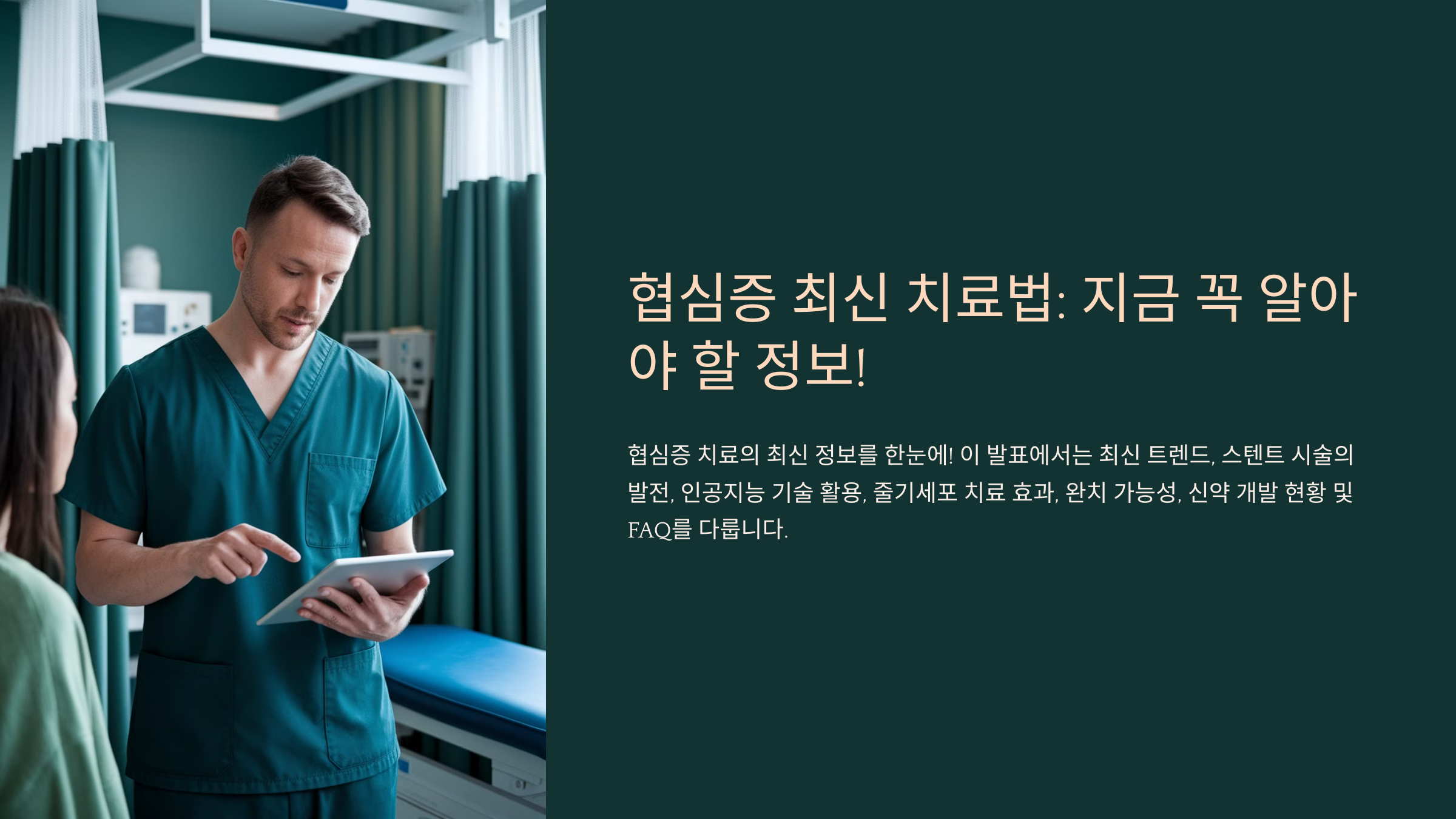 협심증은 심장으로 가는 혈류가 원활하지 않아 가슴 통증을 유발하는 질환이에요. 이는 주로 관상동맥이 좁아지거나 막히면서 발생하죠. 과거에는 약물치료와 스텐트 시술이 주된 치료법이었지만, 최근 들어 인공지능(AI), 줄기세포 치료, 혁신적인 신약 개발 등 새로운 치료법들이 등장하고 있어요.