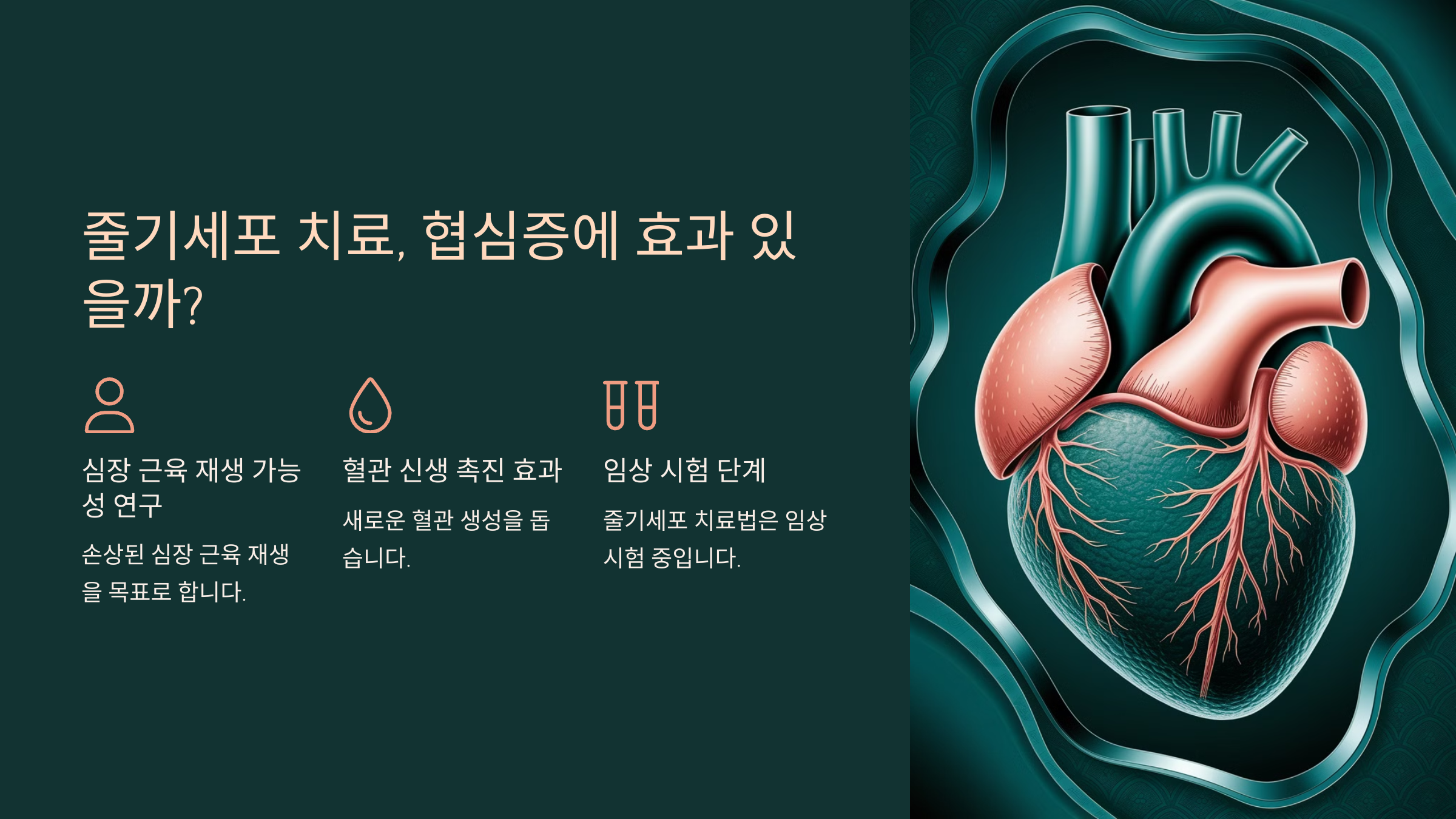 현재 연구에 따르면, 환자의 골수나 지방에서 추출한 줄기세포를 손상된 심장 부위에 주입하면 혈관이 재생되고 심장 기능이 향상될 수 있다고 해요. 특히, 기존 치료로 호전되지 않는 중증 협심증 환자들에게 희망을 줄 수 있는 방법으로 주목받고 있어요.