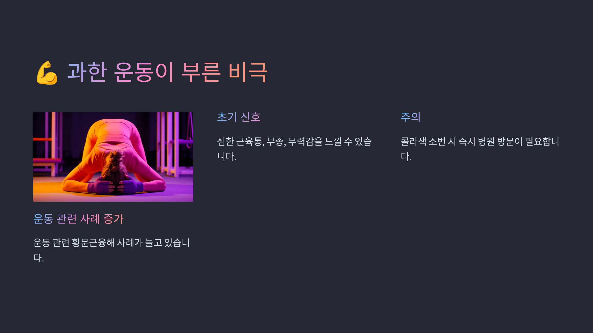 내가 생각했을 때, 요즘 운동 열풍이 불면서 과한 운동으로 횡문근융해증에 걸리는 사람이 많아지는 것 같아요. 운동은 건강을 위해 하는 거지, 몸을 혹사하는 게 아니에요! 🏃♀️