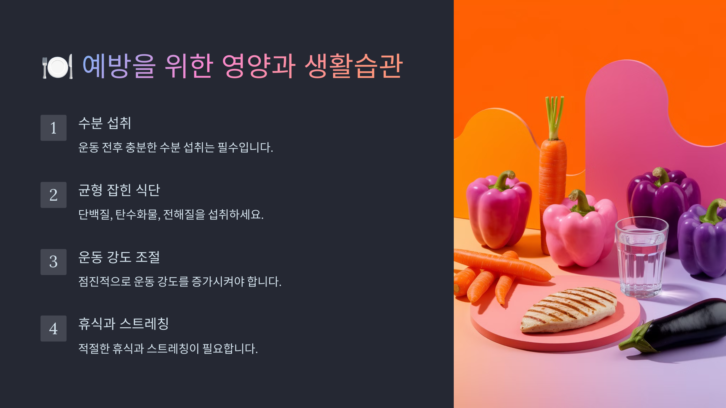 그러면, 횡문근융해증을 예방하려면 어떻게 해야 할까요? 다음 섹션에서 영양과 생활습관을 알아볼게요! 🍽️