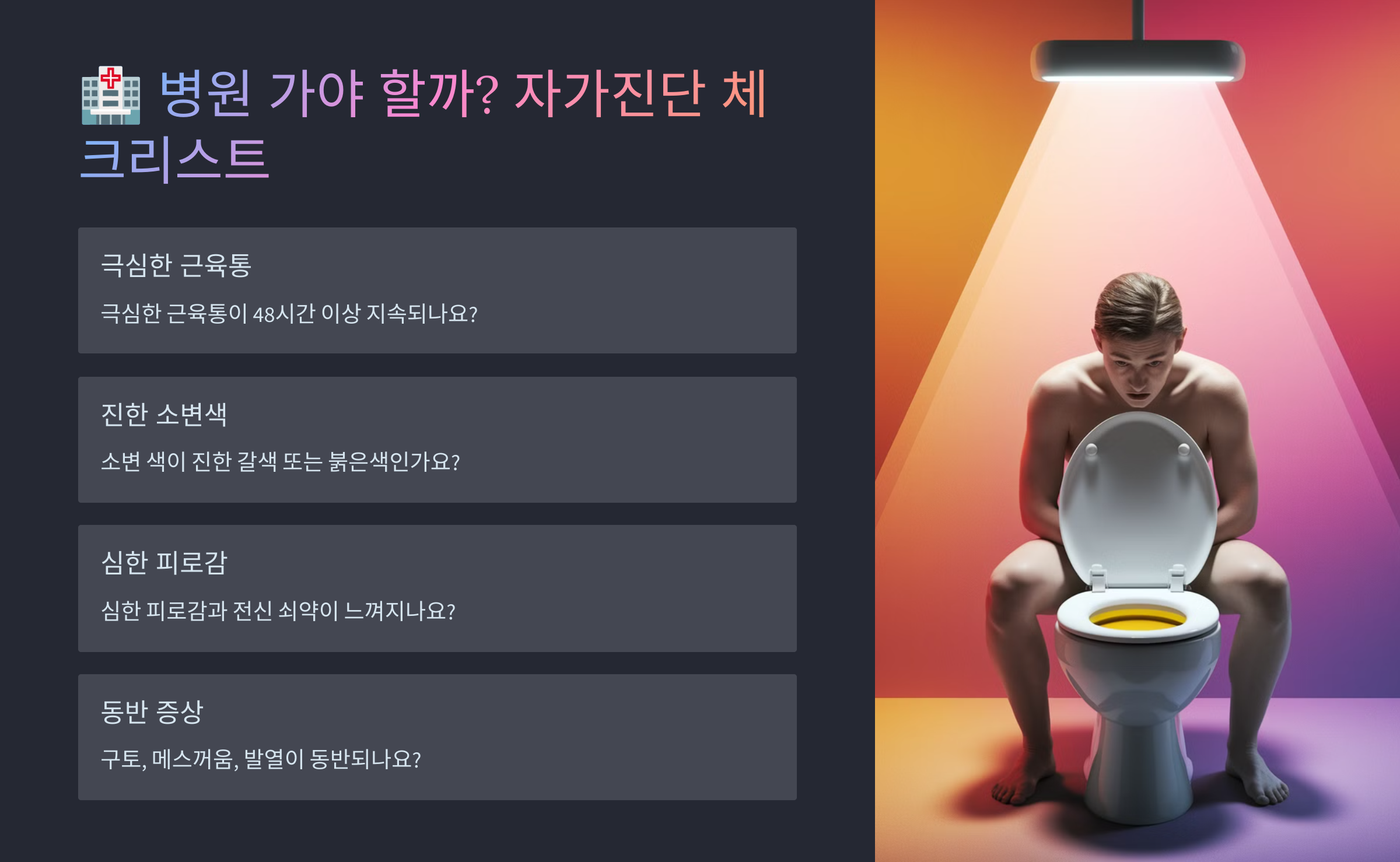 이 증상 중 2~3가지 이상이 동시에 나타난다면, 단순한 근육통이 아닐 수 있어요. 특히 어두운 소변과 함께 극심한 근육통이 있다면, 즉시 병원을 방문하는 것이 좋아요. 🏥