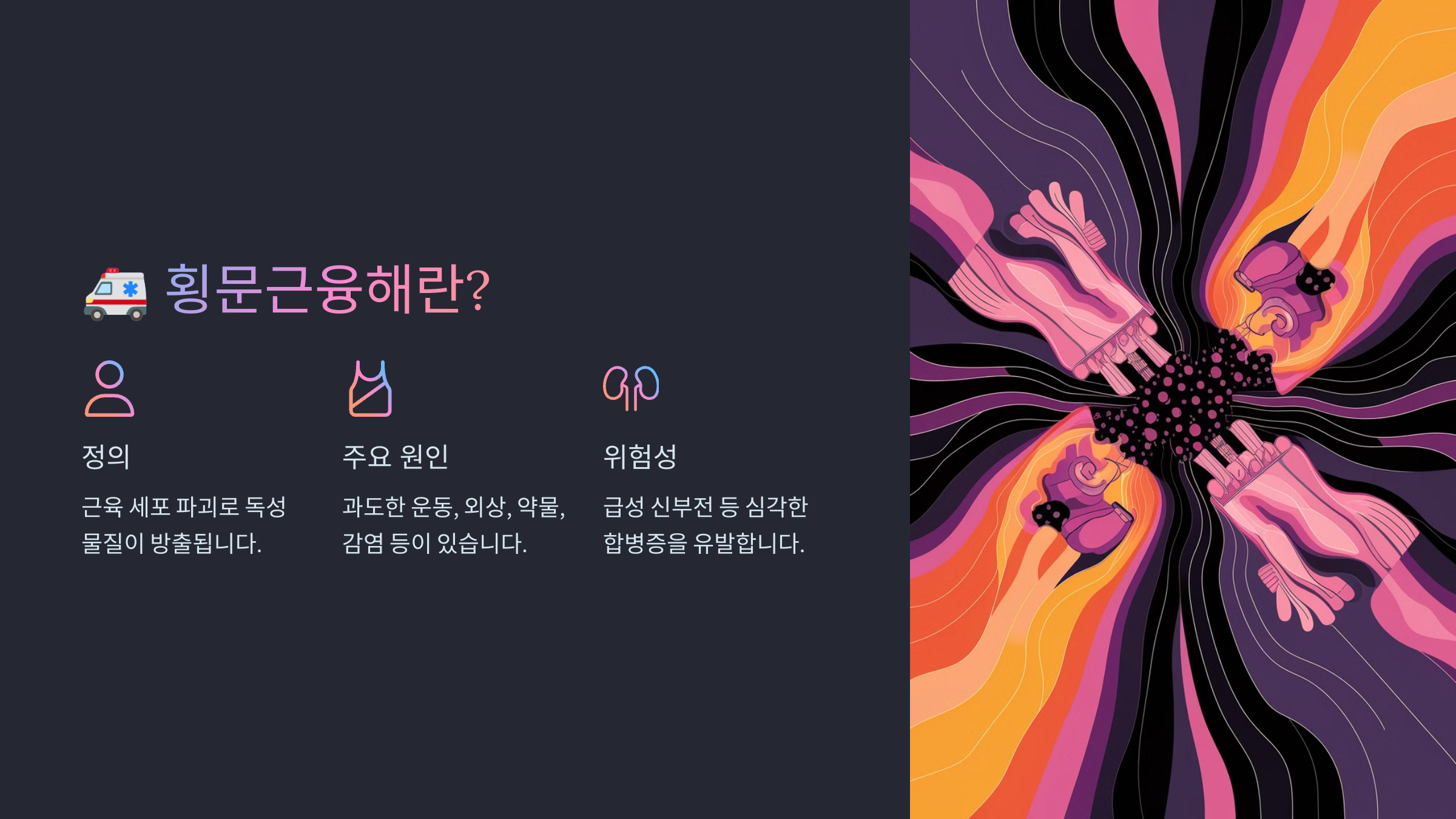 💥 횡문근융해증, 들어본 적 있나요? 이것은 근육세포가 손상되면서 세포 안의 단백질과 전해질이 혈액 속으로 대량 방출되는 위험한 질환이에요. 심할 경우 신장 기능 저하, 전해질 불균형, 심부전까지 초래할 수 있죠.