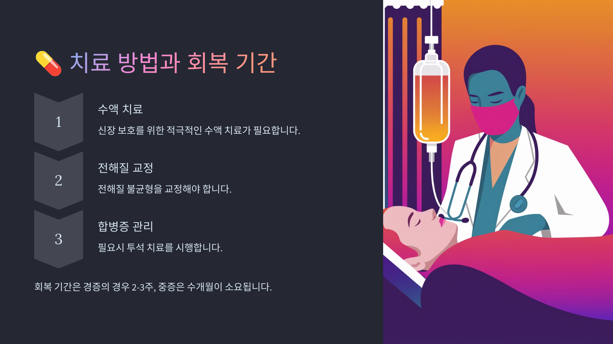 초기에는 수액 치료로 신장을 보호하고 체내 독소를 희석하는 것이 핵심이에요. 하지만 심한 경우 신장 투석까지 해야 할 수도 있어요. 그렇다면 치료 과정은 어떻게 진행될까요?