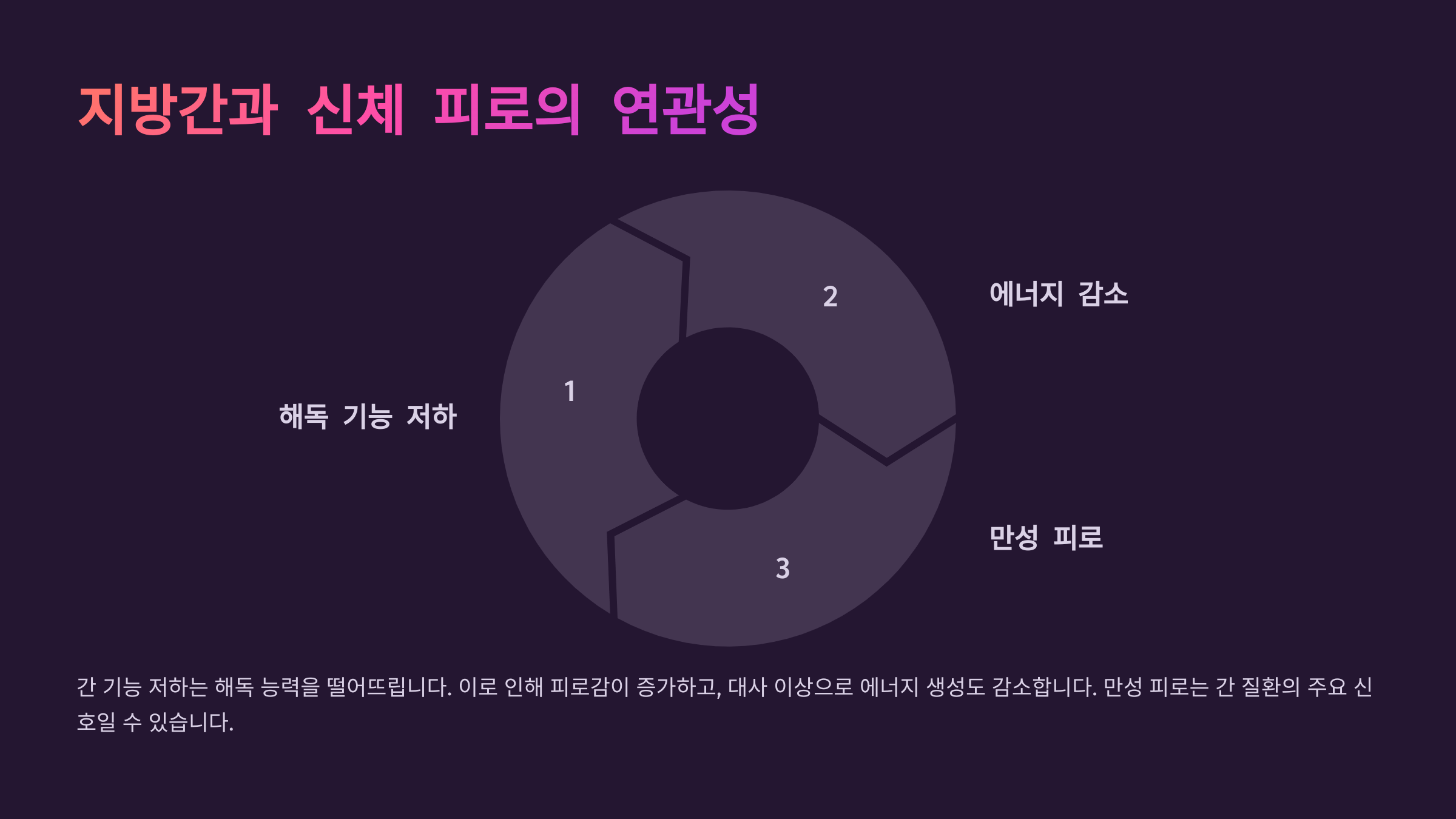 간은 우리 몸의 해독 공장 역할을 하는데, 지방간이 심해지면 해독 기능이 저하되고 신체 에너지도 감소해요. 특히, 간세포가 손상되면 만성 피로, 무기력증, 두통 같은 증상이 동반될 수 있어요. 😵💫