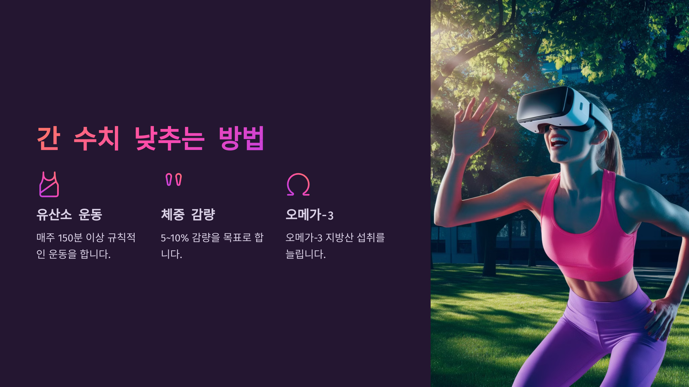 간수치를 낮추려면 생활습관을 개선하는 것이 가장 중요해요! 지방간을 예방하고 간을 보호하는 습관을 가져야 해요. 💪