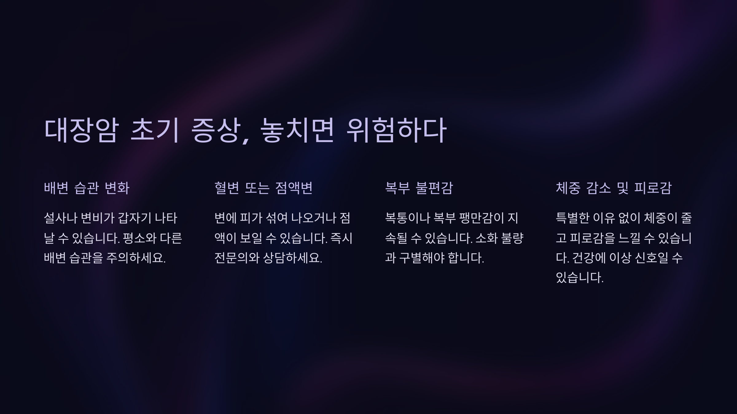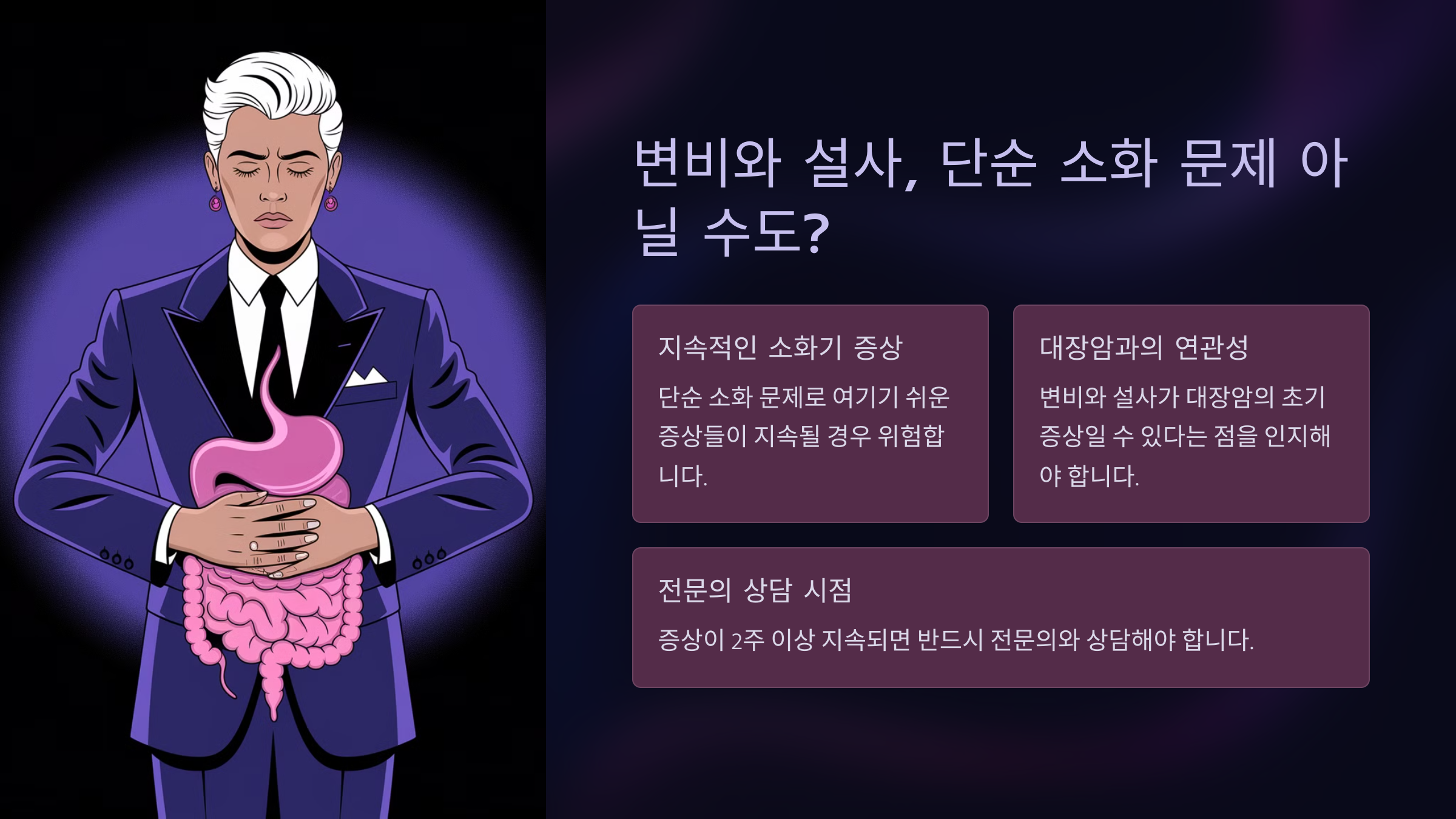 대장암의 초기 증상은 변비나 설사 같은 가벼운 소화기 증상으로 나타날 수 있어요. 하지만 단순한 소화불량이라 생각하고 방치하면 병이 진행될 위험이 크답니다. 대장내시경을 통해 조기에 이상을 발견하고 관리하는 것이 가장 중요한 예방책이에요.