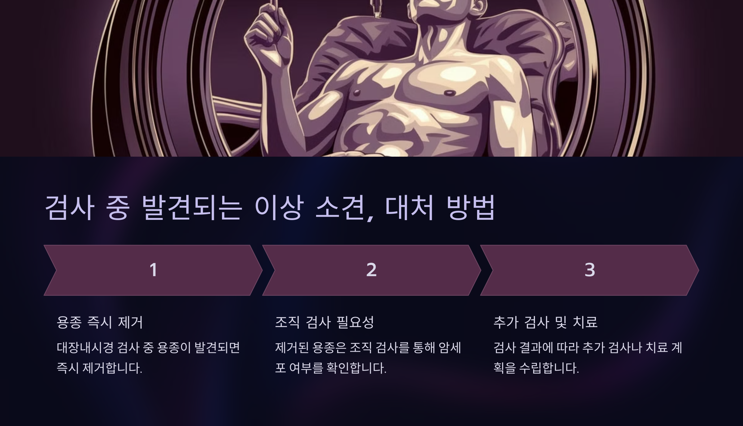 🔹 **이상한 혹(종양 가능성)**: 대장 내 혹이 발견되면 조직 검사를 시행해요. 대부분 양성이지만, 악성 가능성이 있다면 추가적인 정밀 검사가 필요하답니다.