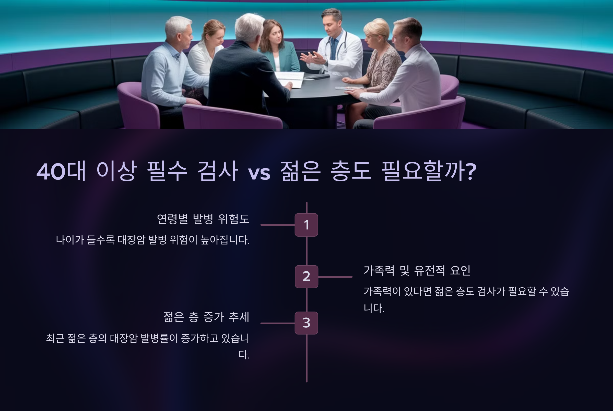 대장내시경은 보통 50세 이후에 받는 검사라고 생각하는 경우가 많아요. 하지만 최근 연구에 따르면 대장암이 젊은 층에서도 증가하고 있어요. 따라서 40대뿐만 아니라 30대에서도 증상이 있거나 가족력이 있다면 검사를 고려해야 해요.