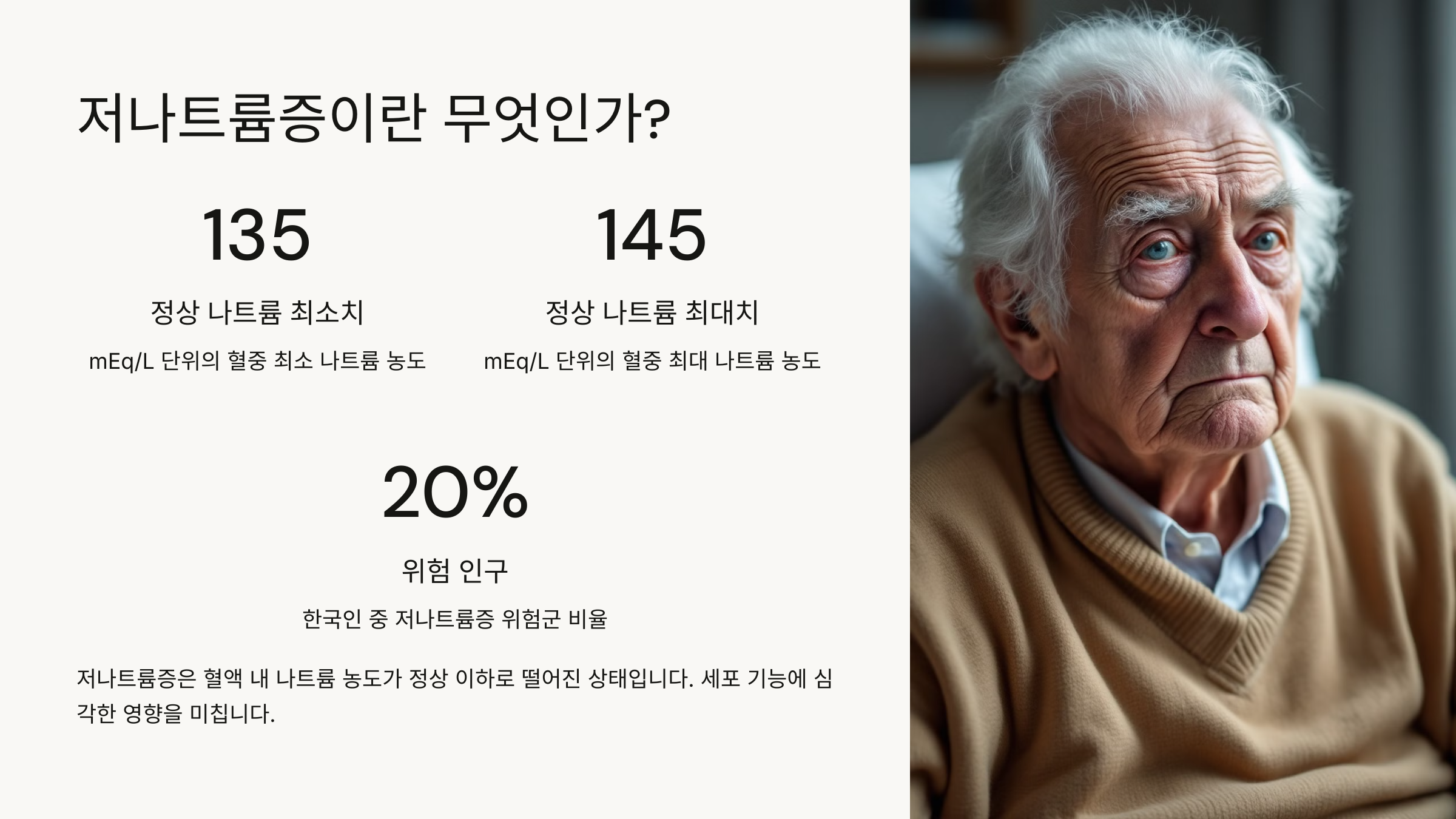 저나트륨증은 혈중 나트륨 농도가 정상 범위(135~145mEq/L)보다 낮아진 상태를 말해요. 나트륨은 체액 균형을 조절하고 신경 및 근육 기능을 유지하는 데 중요한 역할을 해요. 하지만 혈중 나트륨 수치가 135mEq/L 이하로 떨어지면 저나트륨증이 발생하고, 120mEq/L 이하로 내려가면 생명이 위험해질 수도 있어요.