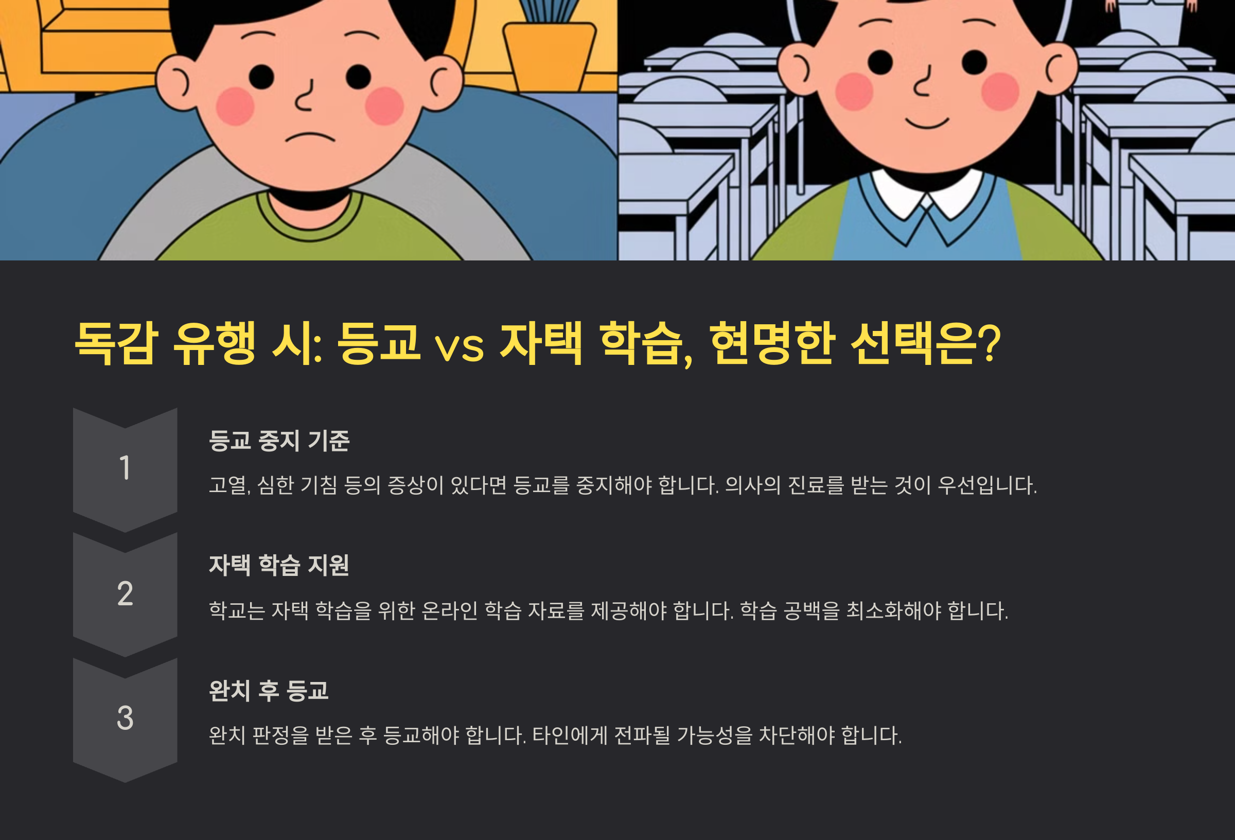 그렇다면, 독감이 유행하는 시기에 건강한 아이들은 계속 등교해도 괜찮을까요? 답은 "상황에 따라 다르다"예요. 독감 환자가 급증하는 경우, 원격 수업을 병행하는 것이 효과적인 방법일 수 있어요.
