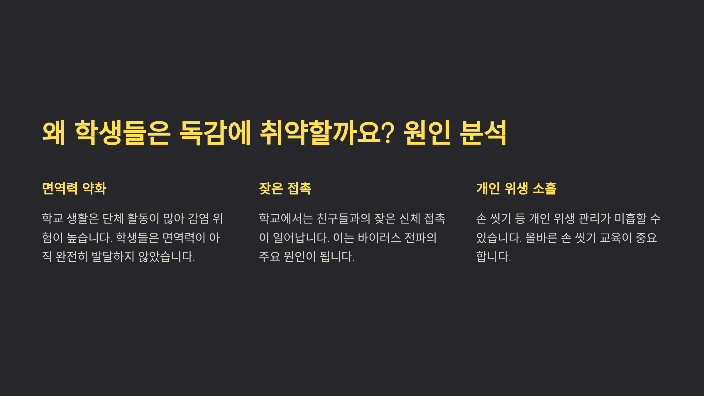 원인은 무엇이었을까요? 첫 번째는 독감 의심 증상이 있는 학생이 등교를 강행한 것이었어요. 기침과 열이 있었지만 중요한 시험이 있다는 이유로 학교에 나왔고, 하루 만에 다수의 친구들에게 바이러스를 퍼뜨린 것이죠.